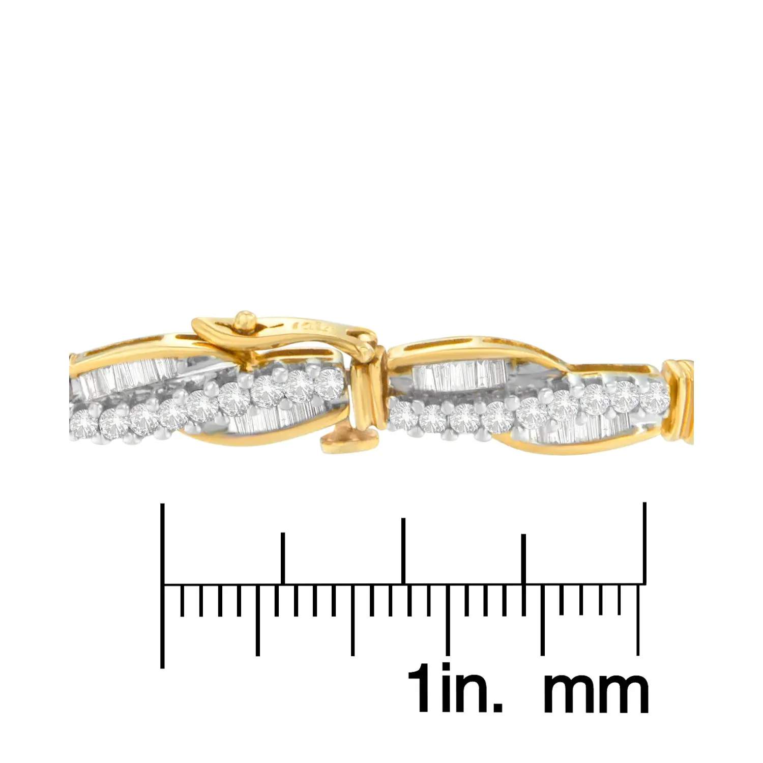 When you’ve found someone to share life’s journey, you want to let them know. This bracelet is an elegant reminder, filled with three carats of glittering round and baguette diamonds that wind their way around an intricate yellow gold setting for a gorgeous finish.