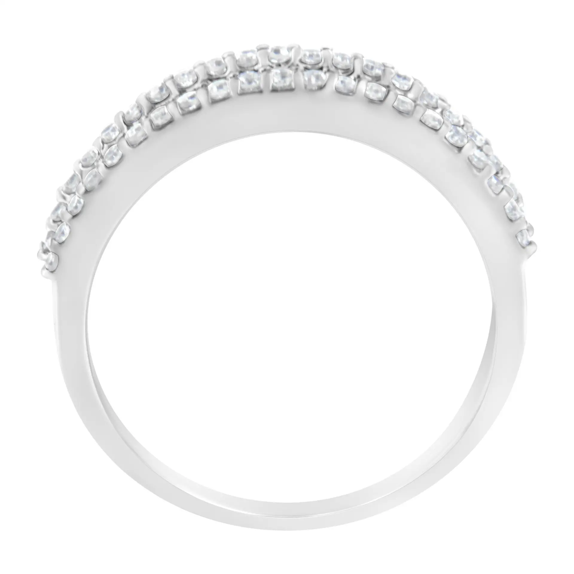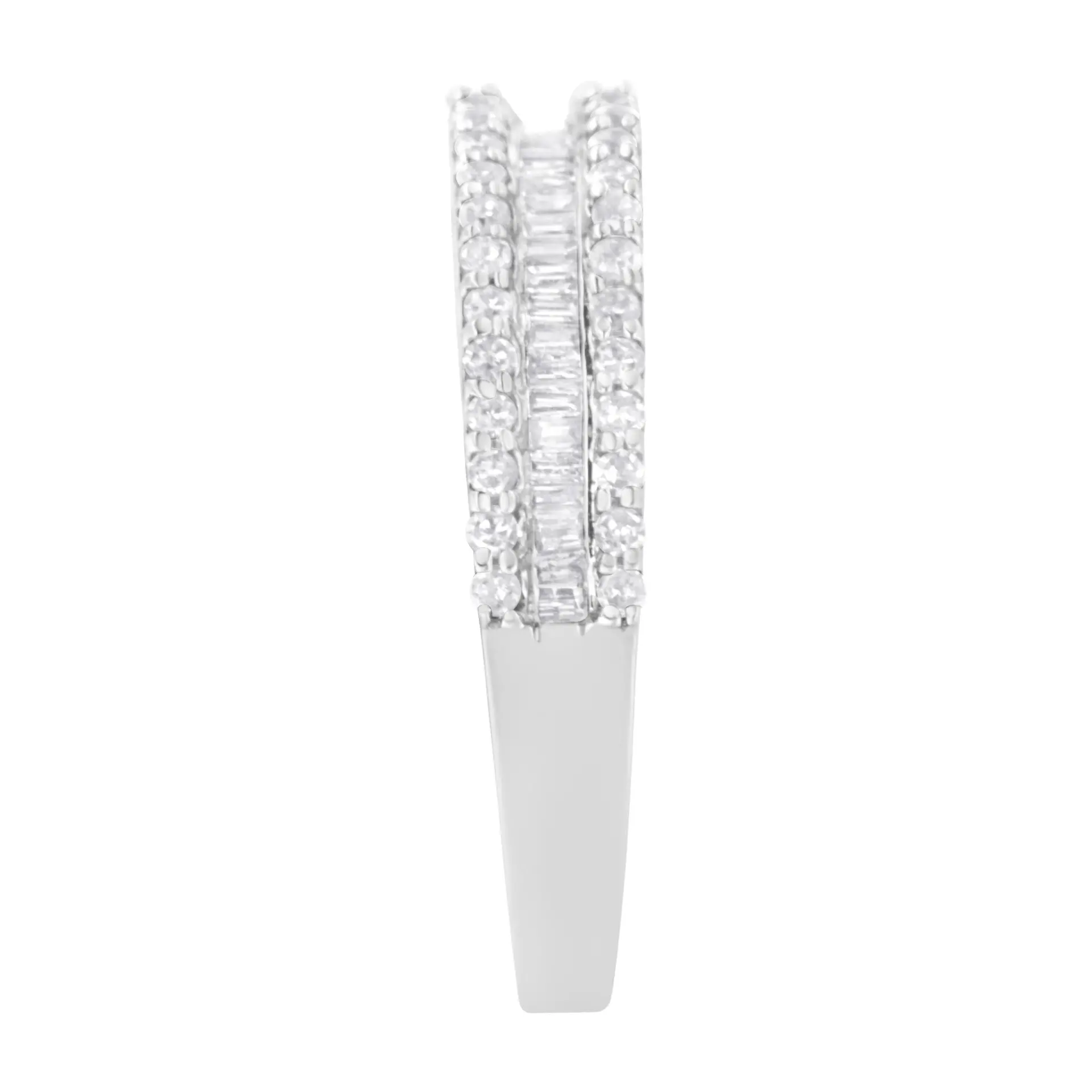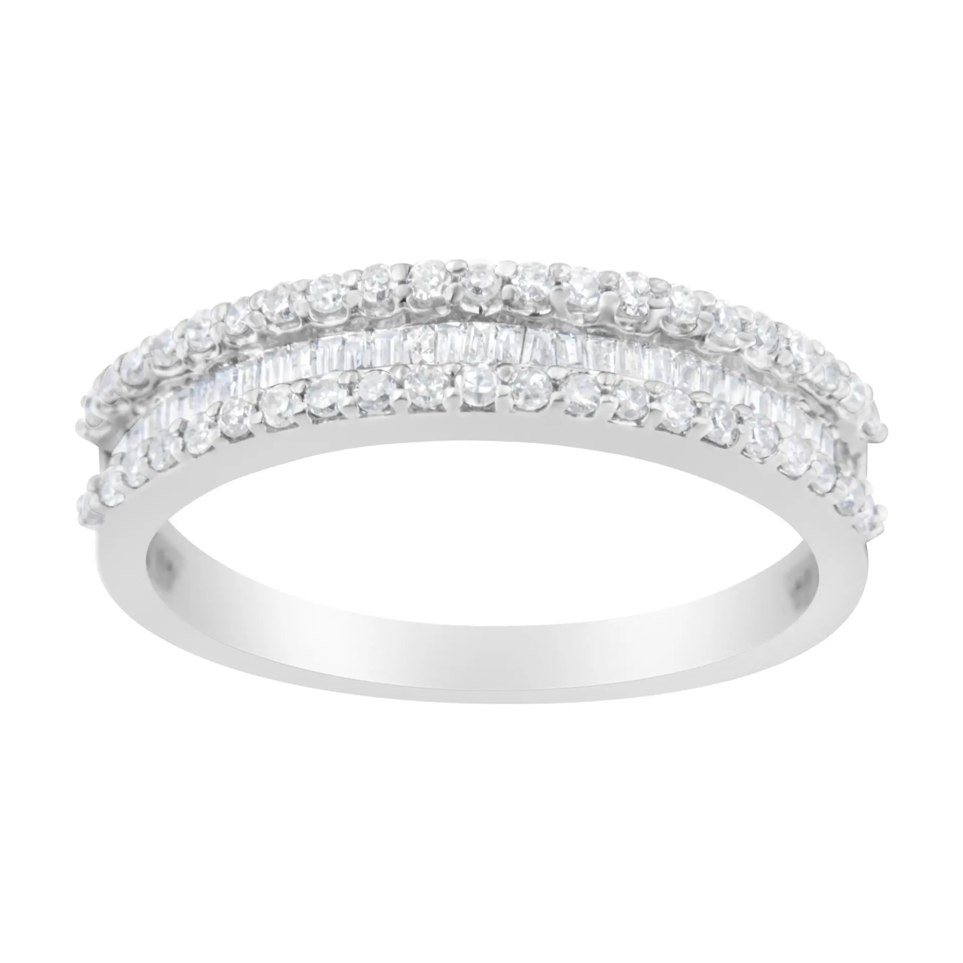 This modern band combines the beauty of different shaped diamonds with 14k white gold. Between two rows of round cut diamonds a row of baguette diamonds sparkles and gives a touch of elegance to the ring design. 1/2 carat TDW of diamonds make up this lovely piece.