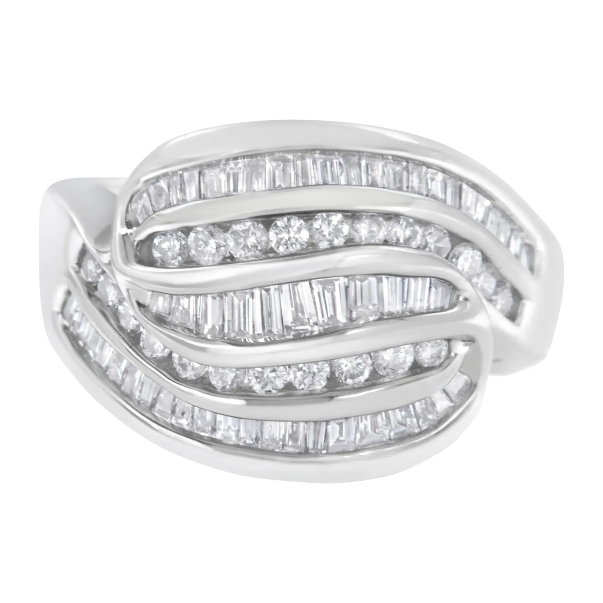 An elegant diamond band that sparkles with five rows of alternating round brilliant cut and baguette diamonds. The wide band is crafted in cool 14 karat white gold. It has a total diamond weight of 1 carat. This is a rare one-of-a-kind piece, and will be a unique addition to your jewelry collection.