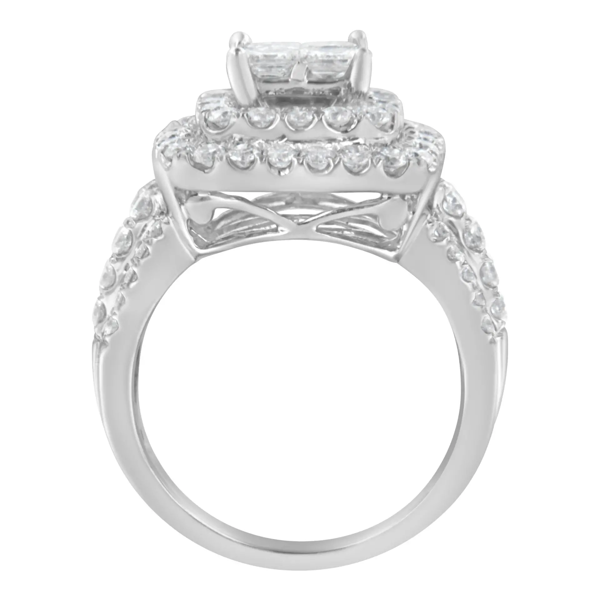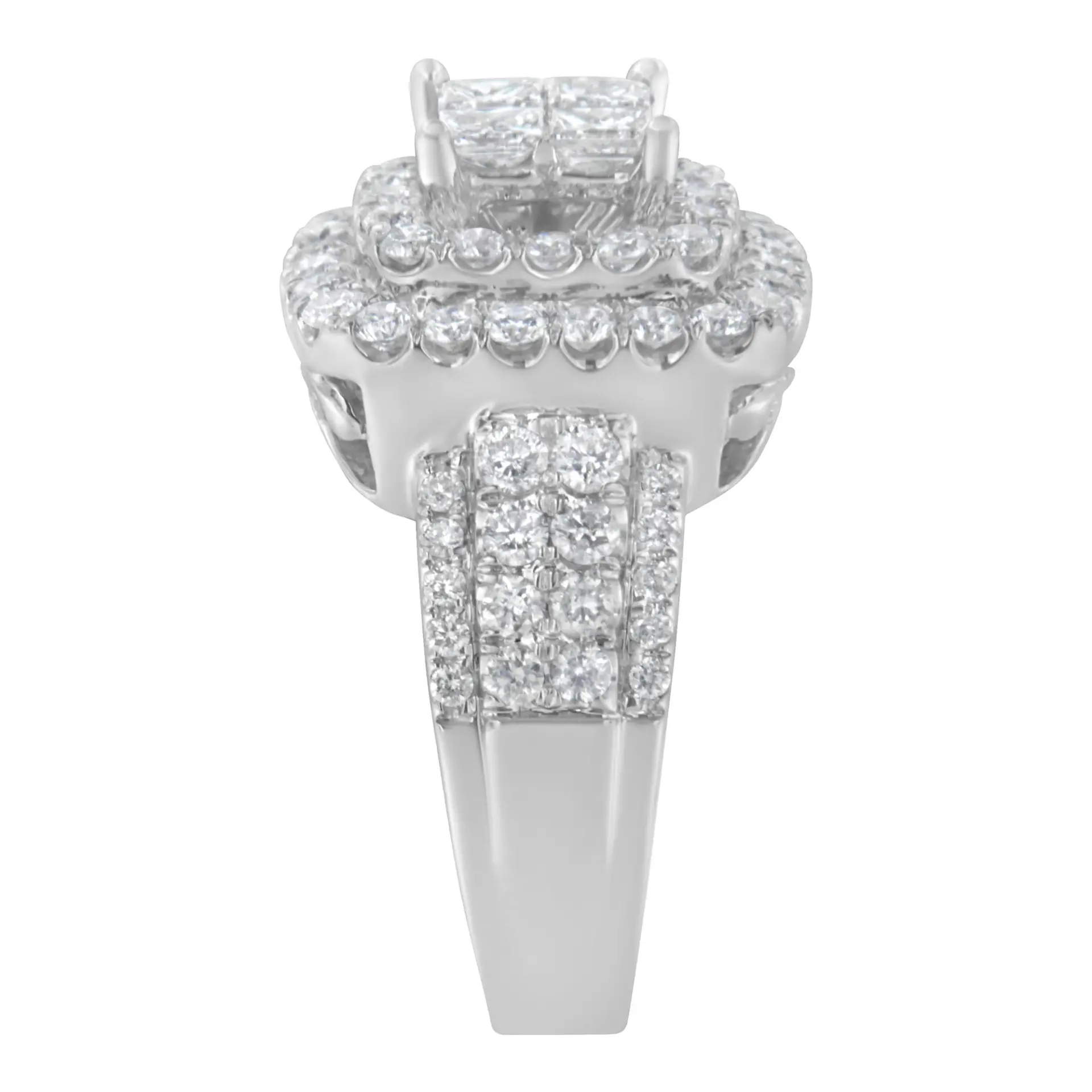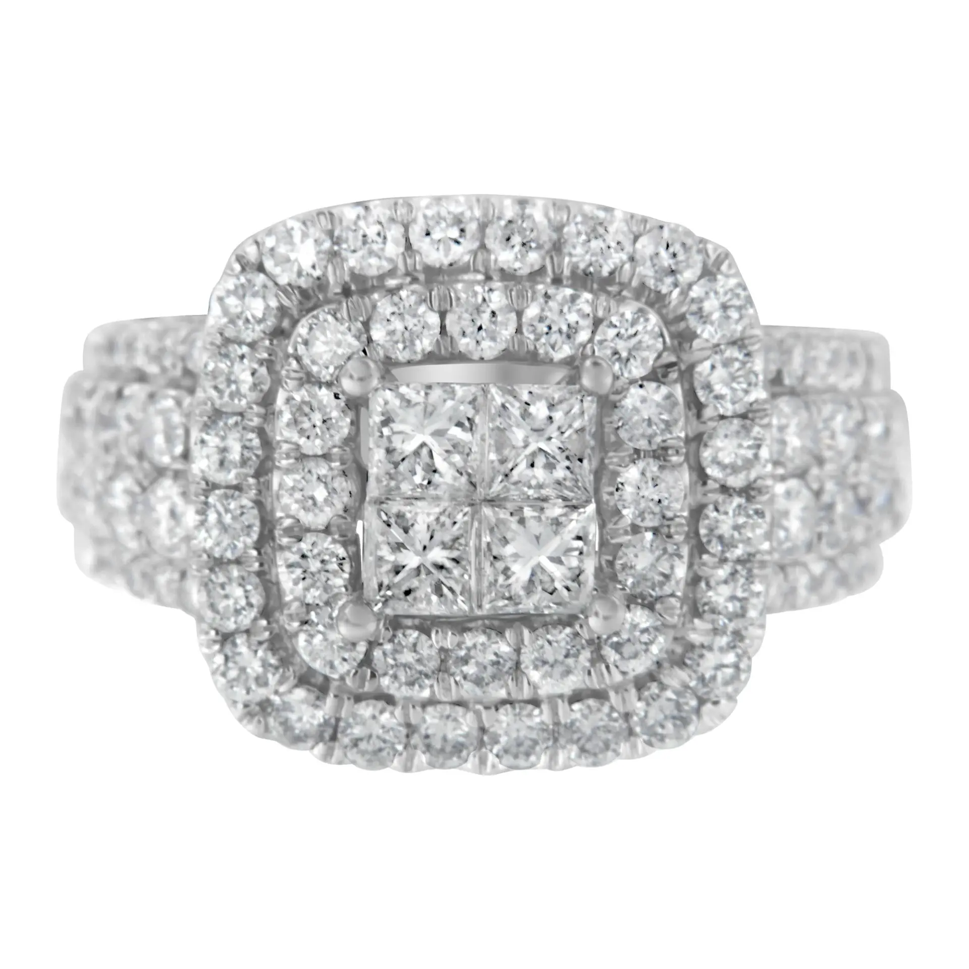 A diamond cocktail ring that sparkles with a central square cluster of princess cut diamonds surrounded by a double halo of round diamonds. The wide band is crafted in 14 karat white gold and has four rows of round diamonds. It has a total diamonds weight of 2 1/4 carats.