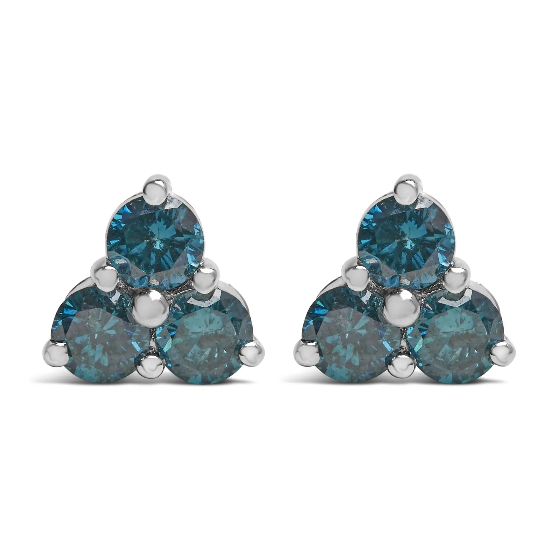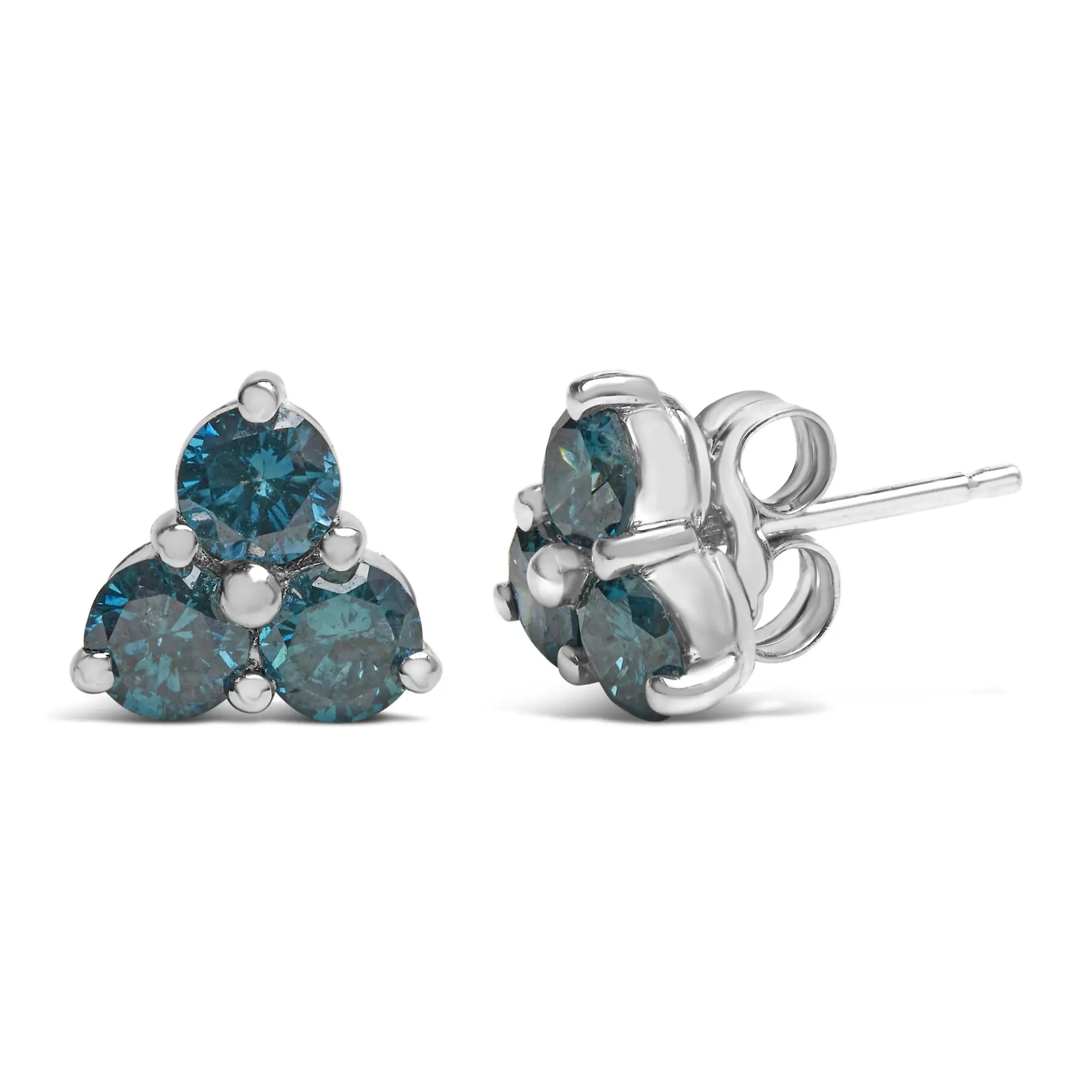A pair of diamond stud earrings with clusters of three blue treated diamonds. This delicate style is crafted in 14 karat white gold, they have a total diamond weight of 1 1/3 carats.