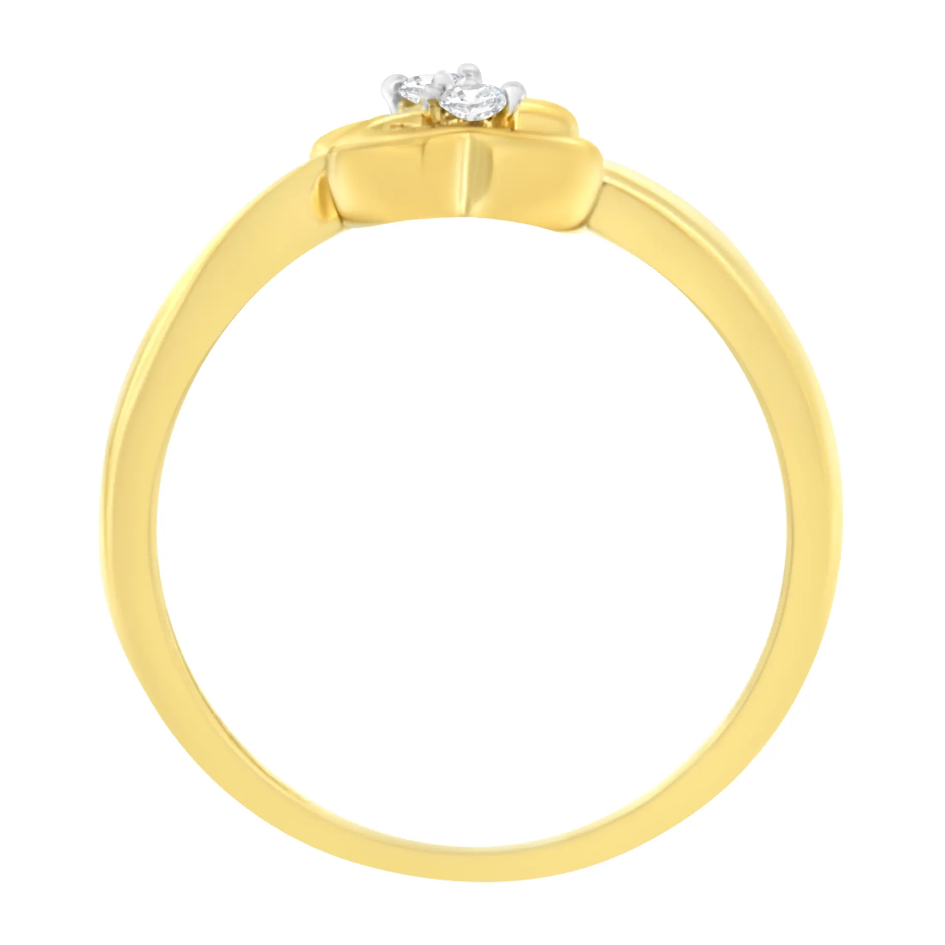 Present this delicate and lovely Dual Heart Diamond Ring as a striking symbol of your undying love. This captivating ring showcases 2 gorgeous round cut accented diamonds, beautifully prong set and rendered to glowing perfection on luminous 14 karat yellow gold. Total diamond weight is 1/20 ctw.