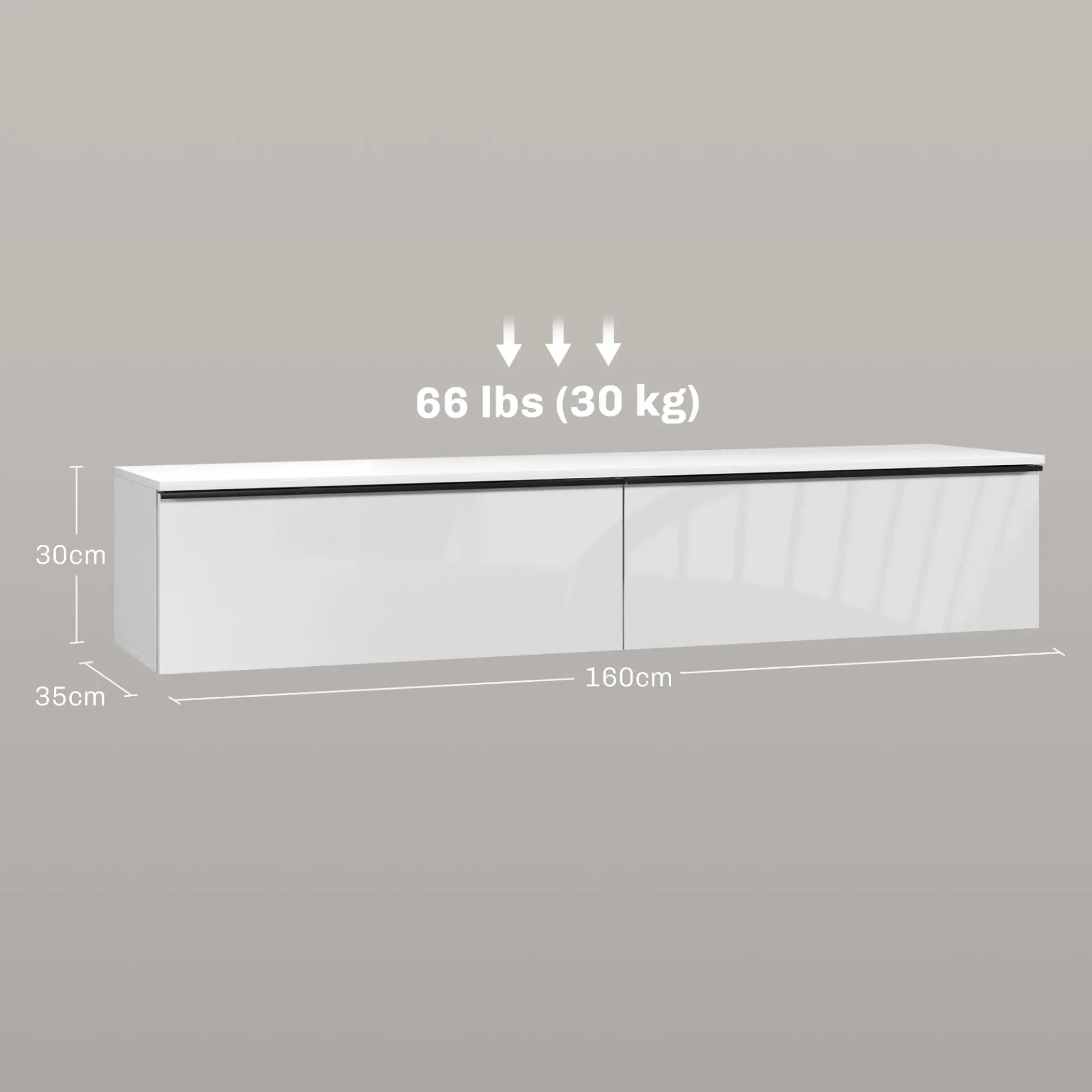 A modern touch for your living room. Do it with this HOMCOM floating TV bench. Fix it your wall and enjoy the style as you relax and watch television or play games. It comes with two cupboards to keep all accessories discreetly stored; the high gloss flip-up door gives it a modern touch. The particle board structure is solid, in a beautiful wood-effect design. Finished with a protective melamine coating.