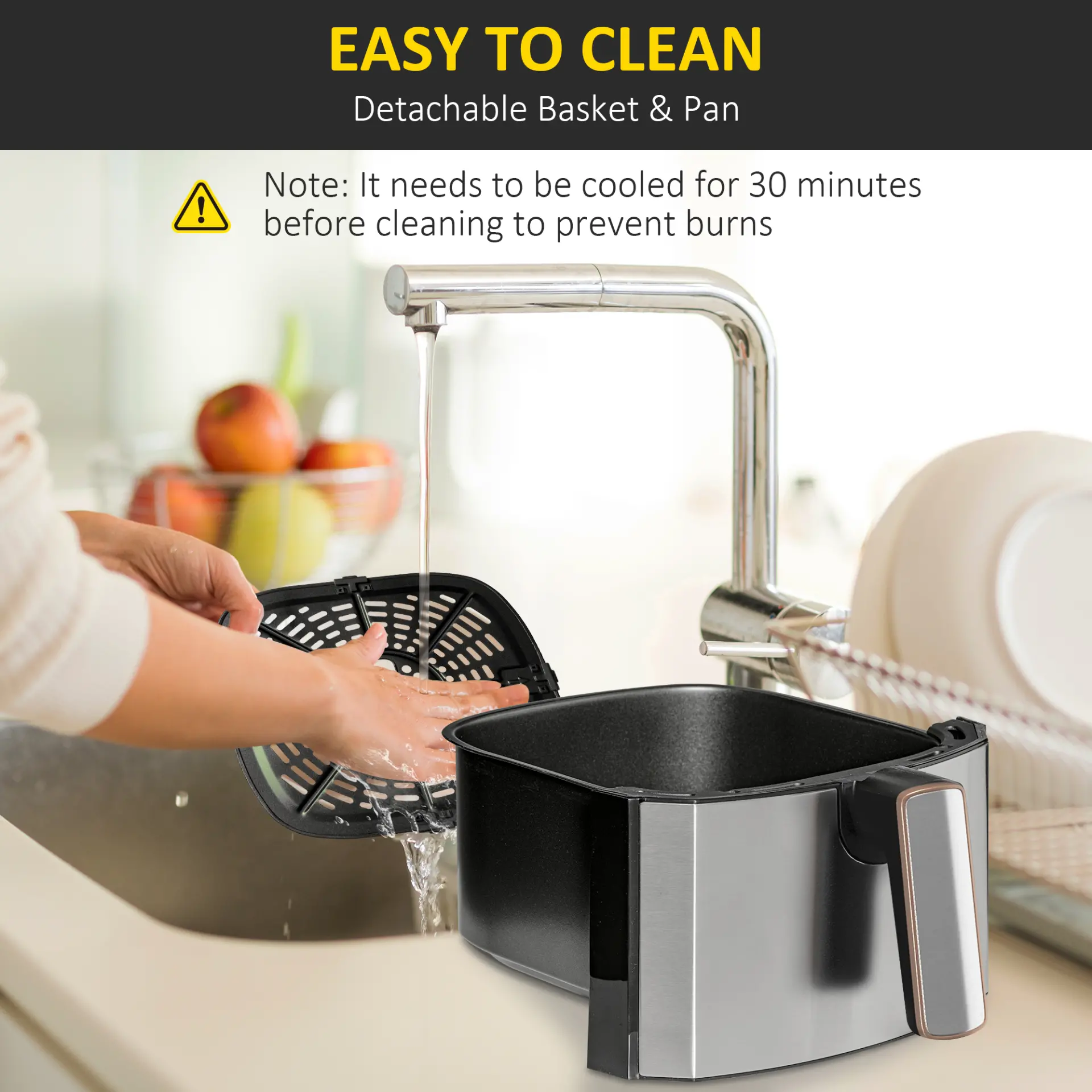 - 6.5 litre basket: This large air fryer is enough for the whole family. Removable to handwash easily. Besides, it needs to be cooled for 30 minutes before cleaning to prevent burns.