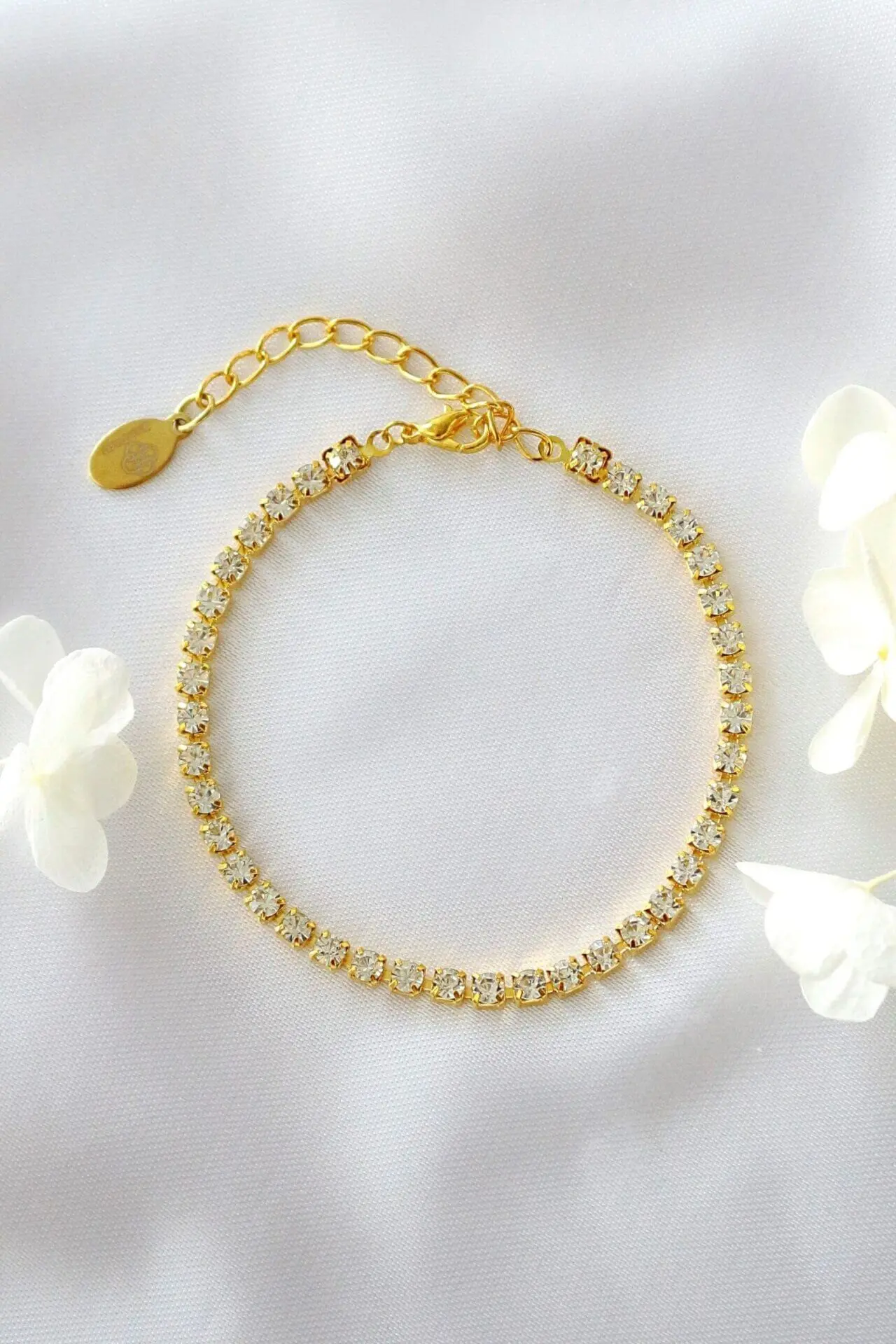 This sparkling link bracelet is made of 18 karat gold plated copper and diamond cut cubic zirconia inlays on each link.