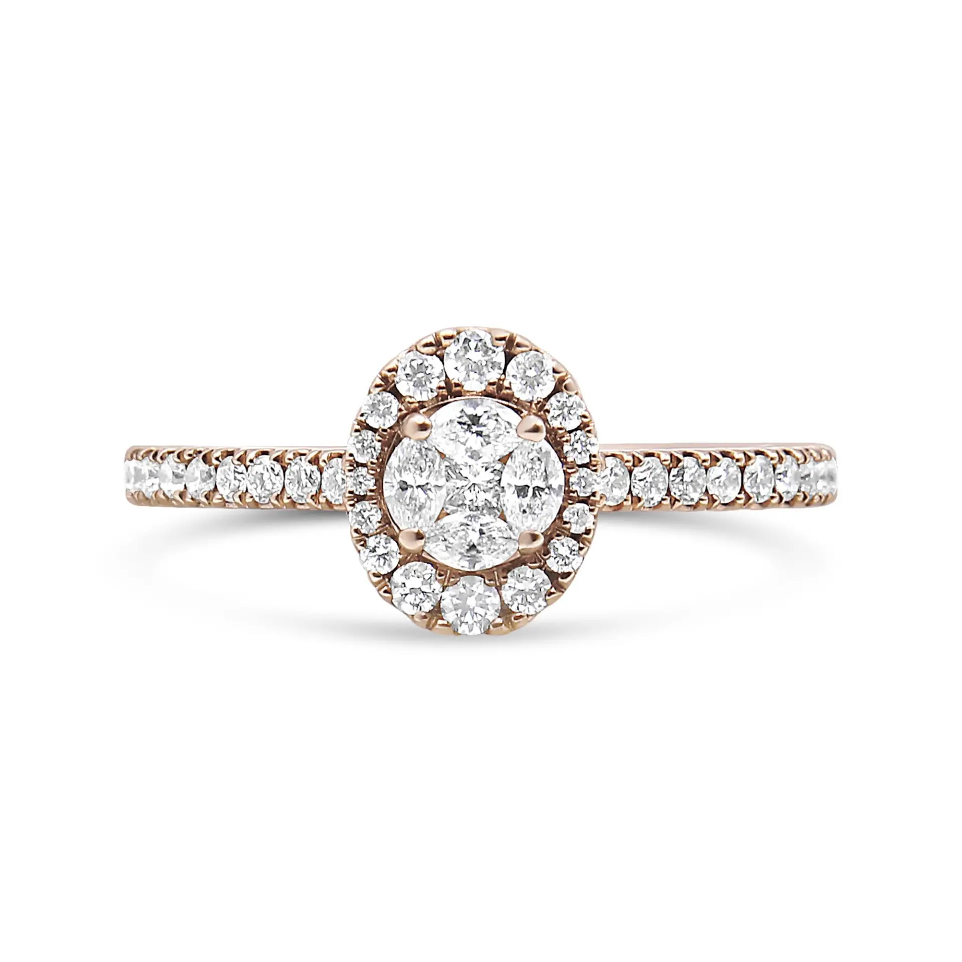 A confident expression of love, this diamond engagement ring ensures a marvelous moment. Created from deep hued 18K rose gold, this bold style showcases a stunning diamond look. 4 marquise shaped diamonds close on a center round diamond to give the impression of a much larger, solitaire round diamond. A halo of round diamonds surrounds this centerpiece and come together to form an oval-shaped diamond composite. Smaller paired diamonds are set along the shank for added sparkle. Finally, hidden under the head are miglrain leafs. Radiant with 1/2 cts. t.w. of diamonds and a brilliant buffed luster, this engagement ring suits her glamorous taste.