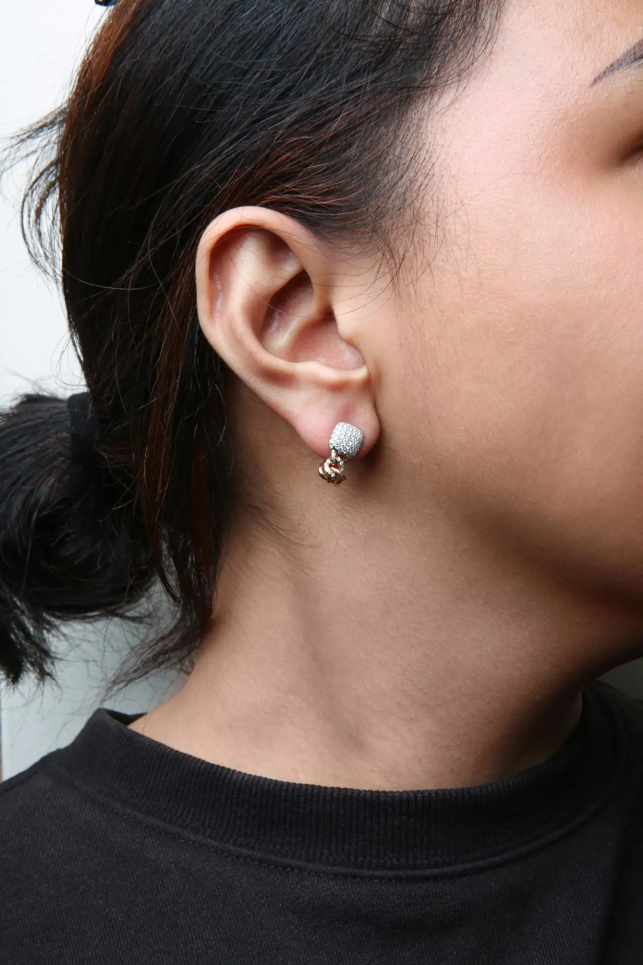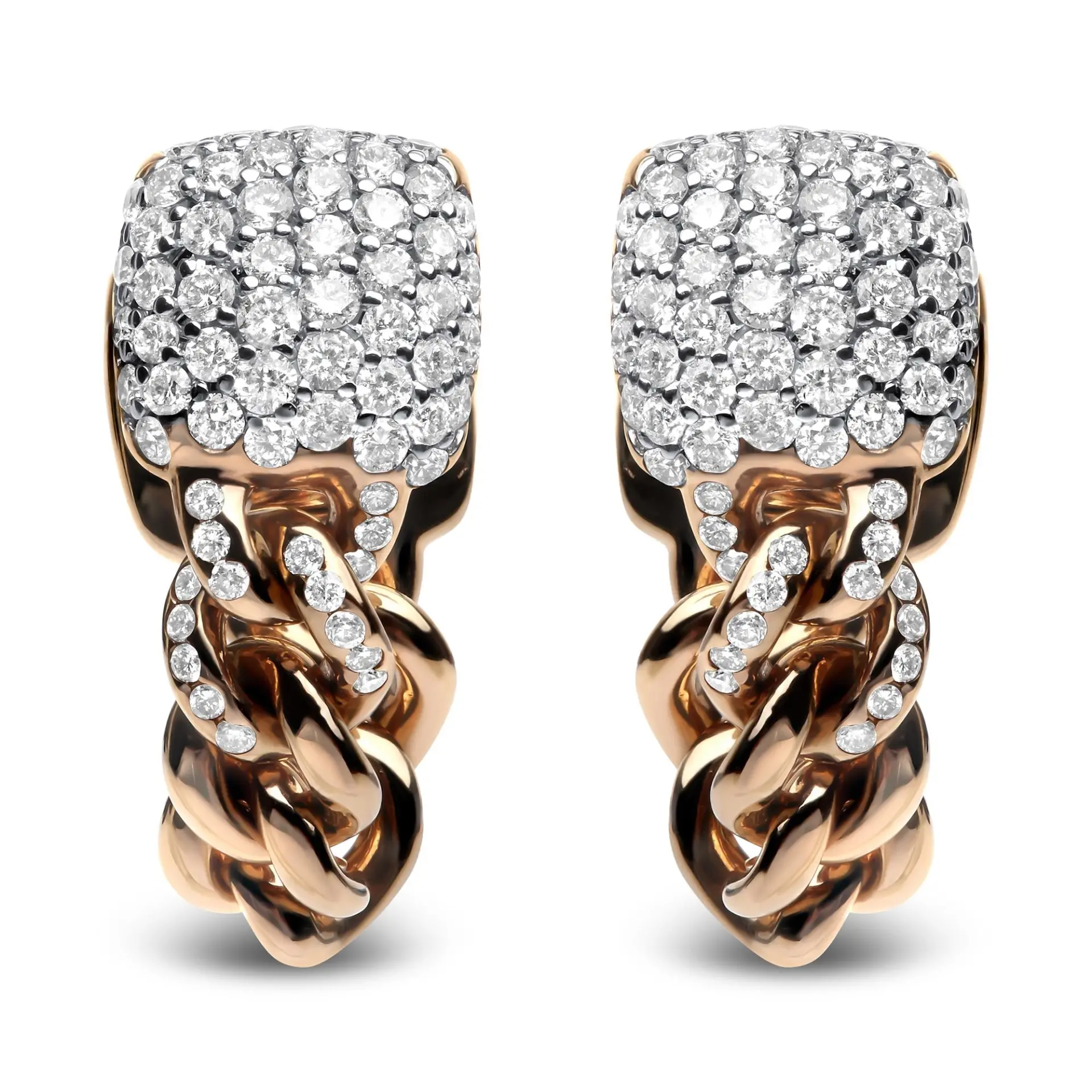 A classic huggie with an edgy twist, these 18k rose gold earrings will put you directly in the spotlight with their unique design. The pair exudes elegance with 128 total diamonds that cluster in prong-settings in a squared silhouette before trailing down along the front of the cuban chain inspired design. These glamorous diamonds total 3/4 cttw with an approximate G-H Color and SI1-SI2 Clarity. The glitter and sway of these huggie earrings will be one to remember. Snap post findings secure these stylish earrings in your ears for comfortable, worry-free wear all day long.