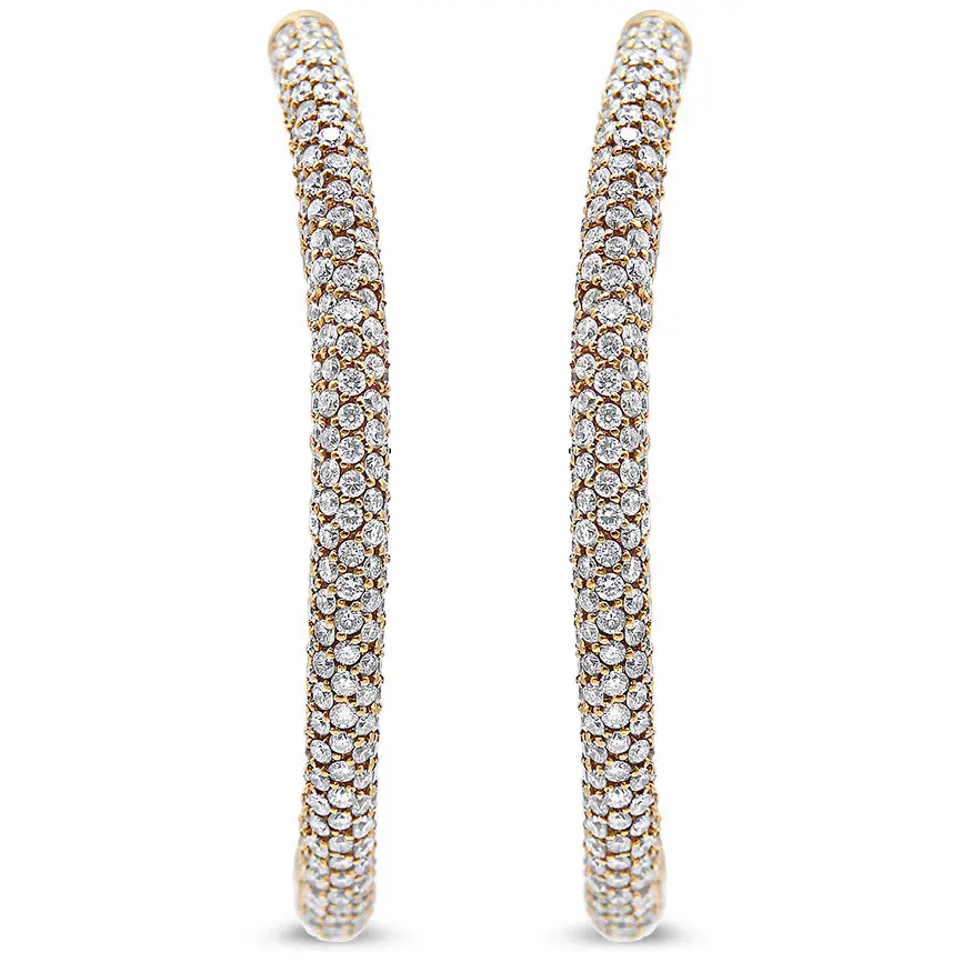 A dewy oval silhouette drips with French pave-set diamonds giving these 18k rose gold hoop earrings a dazzling modern look that commands attention with their subtle light. These stunning eternity hoop earrings feature 1,268 natural diamonds on the front, back, left, right and inside giving you 360 degrees of sparkle. These 6.90 carat diamond hoop earrings are a one-of-a-kind treasure. The earrings dangle approximately 1 1/2″ inches from your earlobe. Comes with an omega back for a secure and comfortable fit.