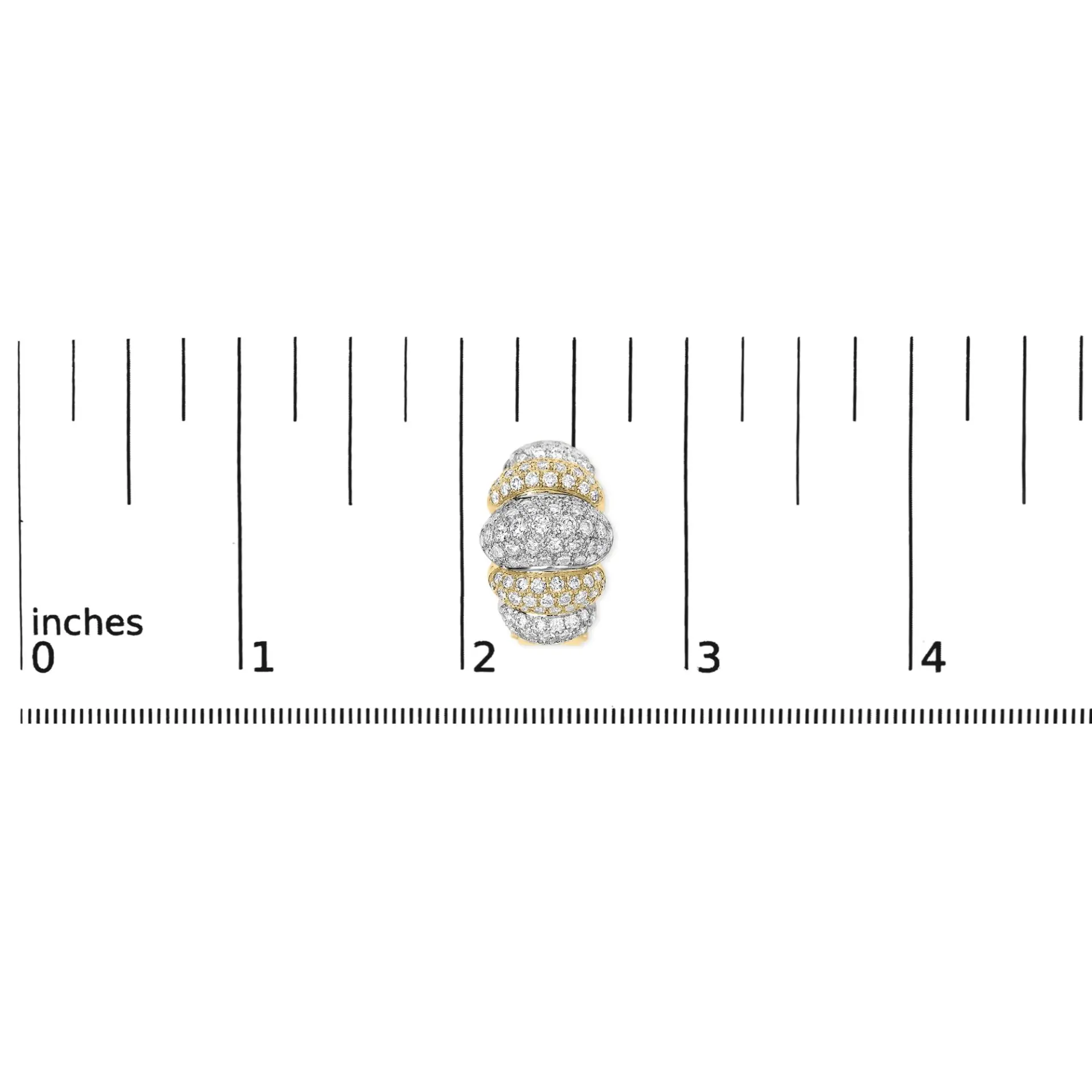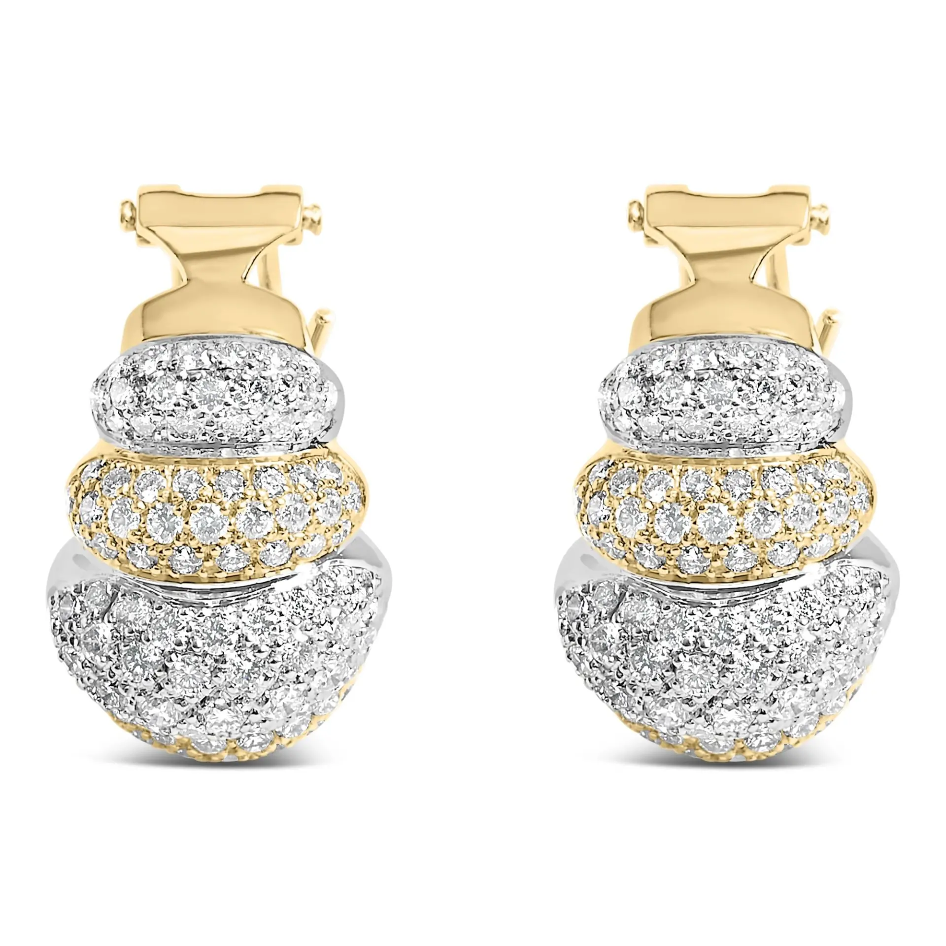 Experience the epitome of elegance and design with our stunning 18K two-toned gold diamond earrings. Each piece is a masterful assembly of style and sparkle, featuring an enchanting three-tiered, domed button design that radiates with sophistication. Intertwining yellow and white gold, with the latter exquisitely rhodium-plated for an extra touch of radiance, these earrings captivate from every angle. Adorned with 5.00 carats of pristine, natural round-cut diamonds, boasting a G-H color and VS2-SI1 clarity, these gems catch the light with mesmerizing brilliance. The omega back closure ensures a secure and comfortable fit, perfect for lending a touch of glamour to every occasion.