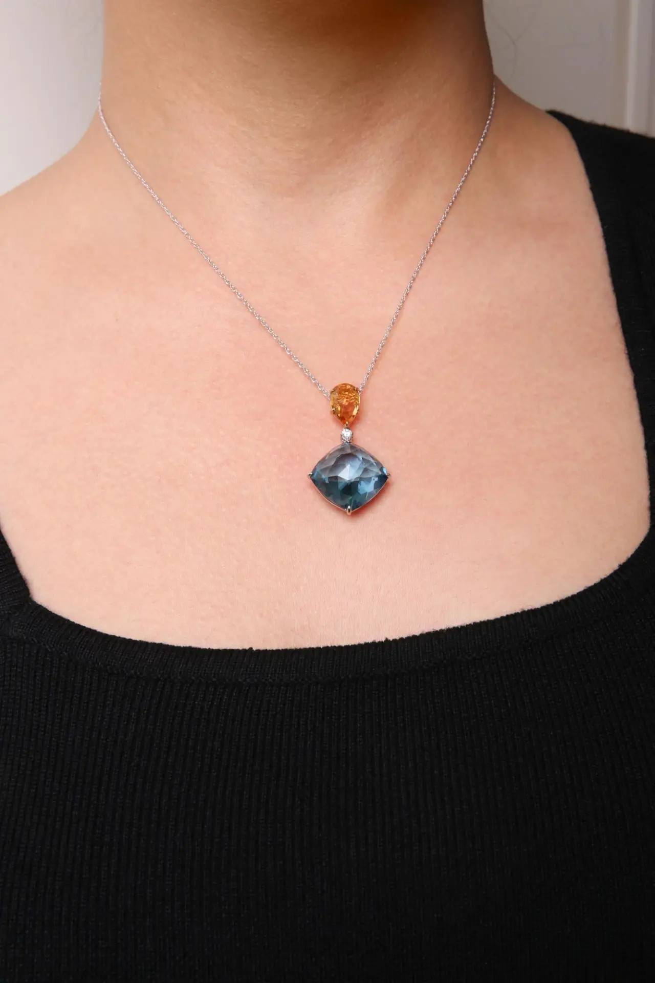 Unleash your inner goddess wearing this marvelous pendant necklace made from genuine 18k white and yellow gold with natural gemstones. At the bail nestled a radiant 1.2mm pear-cut heat-treated yellow citrine nestled in a 5-prong setting. Directly below, a round diamond accent stone adds a dash of sparkle from a prong setting with an approximately G-H Color and SI1-SI2 Clarity. The finale of this glamorous piece is a 20mm cushion cut topaz in a heat-treated sky blue shade, nestled within a 4-prong setting. This dazzling pendant suspends gracefully from an 18″ rope chain that secures with a spring ring clasp.