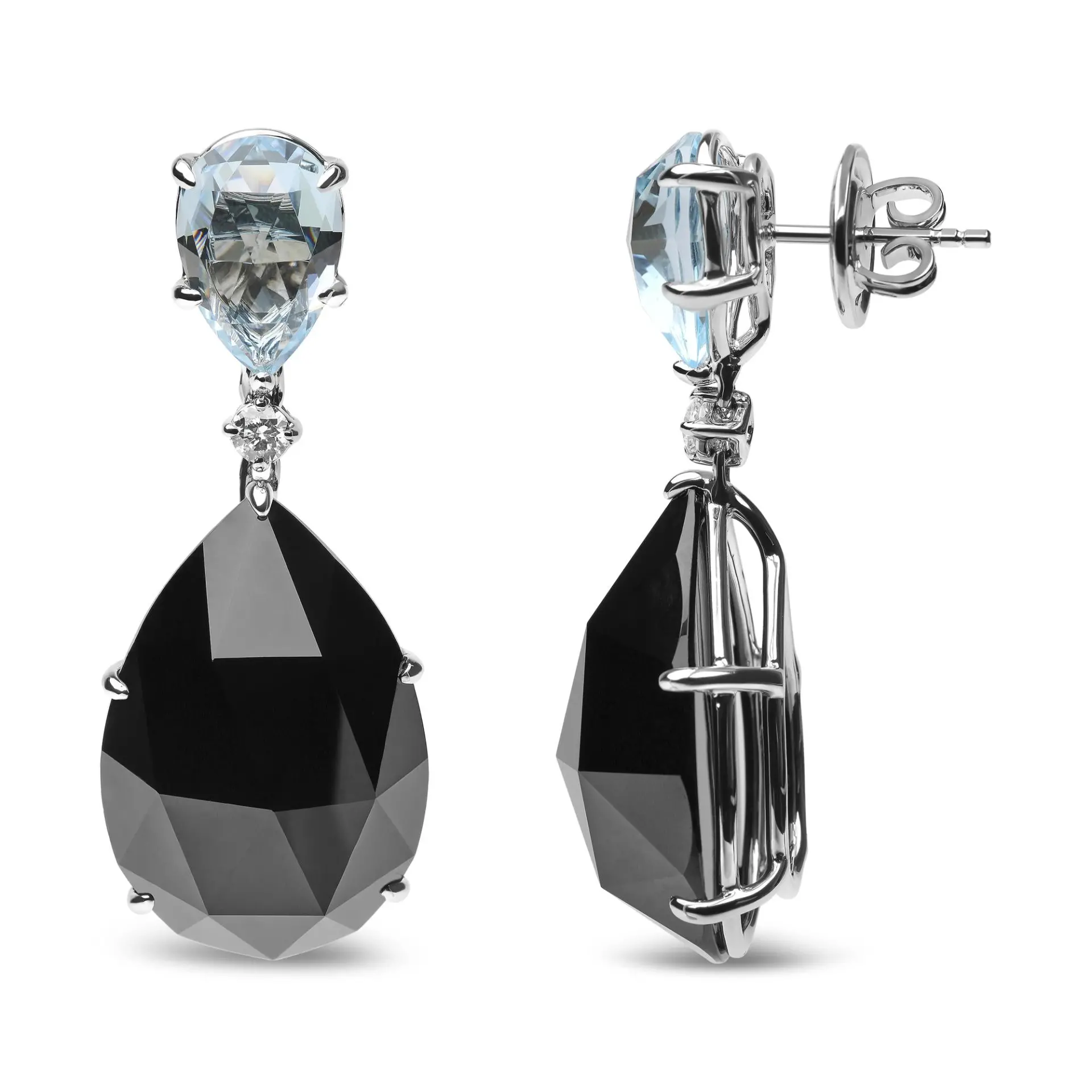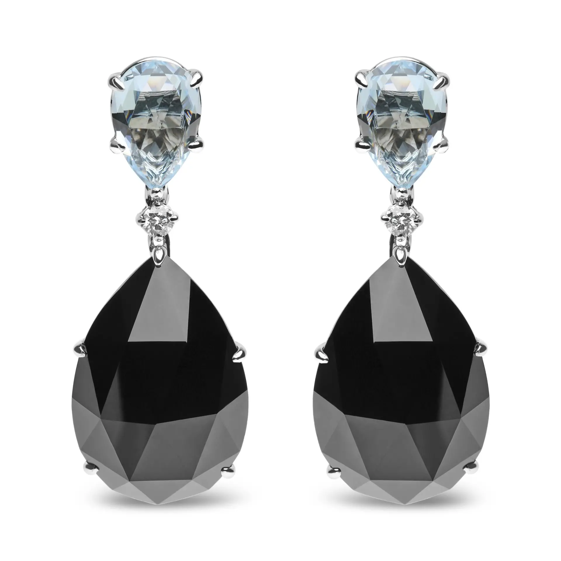 A sultry seduction takes hold of these gorgeous dangle drop earrings crafted of genuine 18k white gold, a metal that will stay tarnish-free for years to come. The upper dangle sets a glamorous start with a natural 12x10mm pear-cut heat-treated sky blue topaz gemstone in a 4-prong setting. On each earring rests round, prong-set diamonds that total 1/5 cttw with an approximate G-H Color and SI1-SI2 Clarity. The lower dangle is an eye-catcher! A natural 25x18mm pear-cut heat-treated black onyx gemstone shows off in a 4-prong setting in a flirty style you’ll love to wear. These pierced earrings secure in the ear via push back findings.