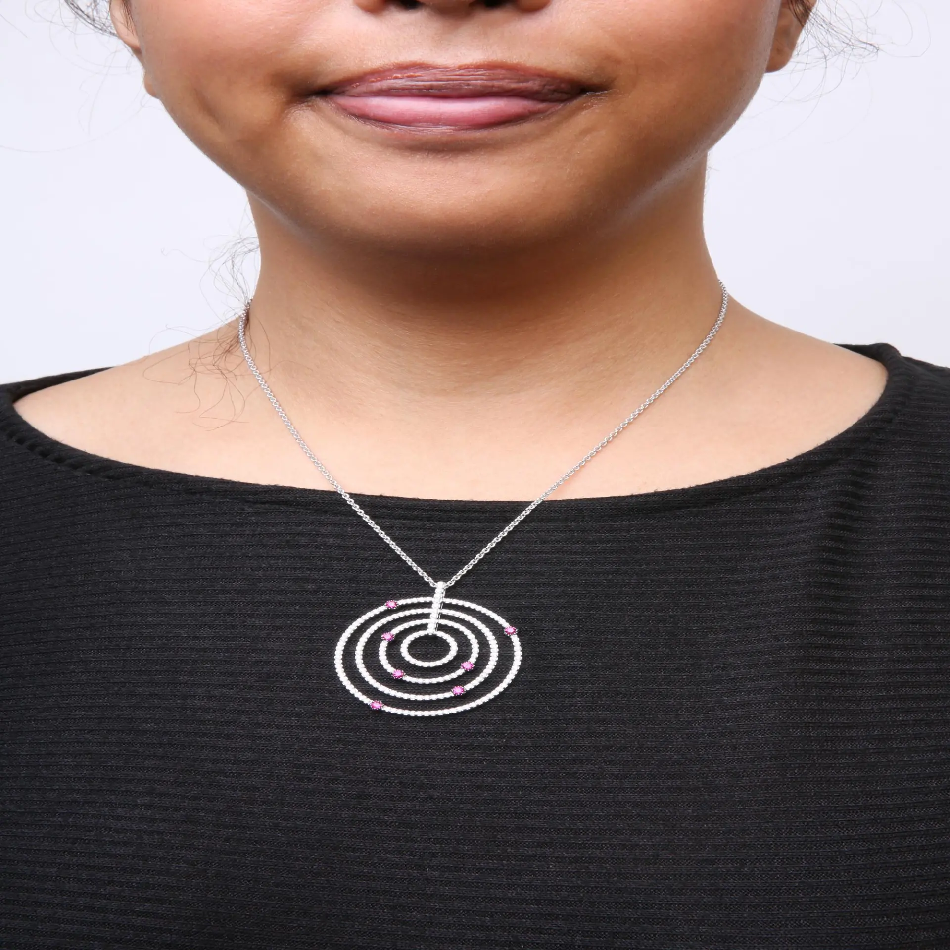 Be the first to review “18K White Gold 2 1/6 Cttw Pave Set Diamonds and Red Ruby Openwork Circles 18″ Pendant Necklace (G-H Color, SI2-I1 Clarity) – Adjustable up to 16″ – 18″”