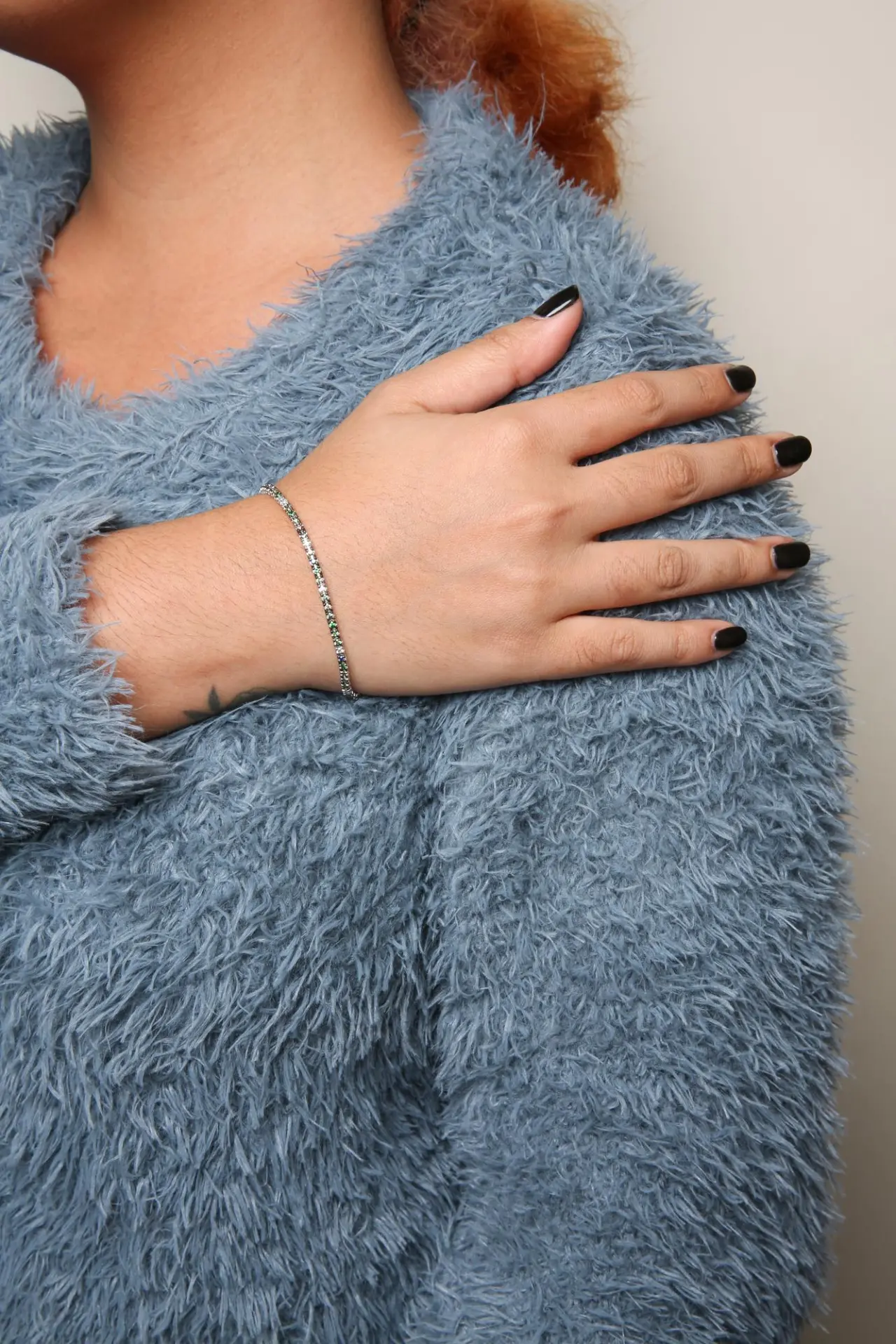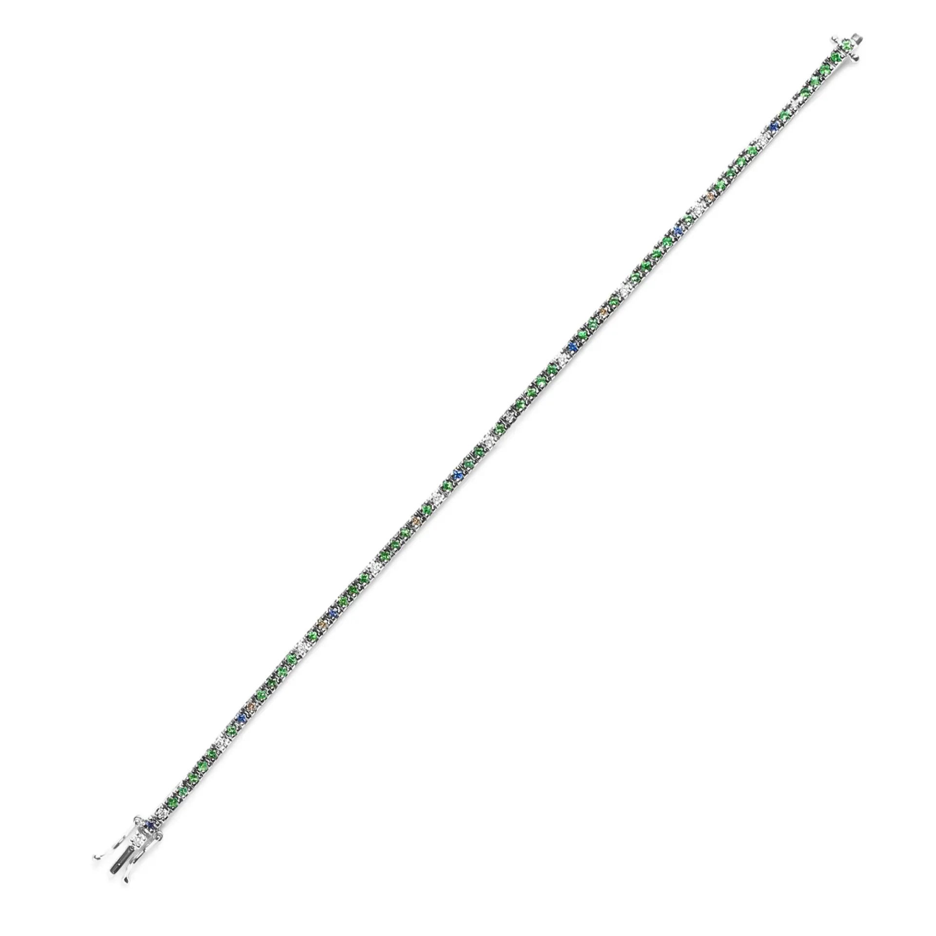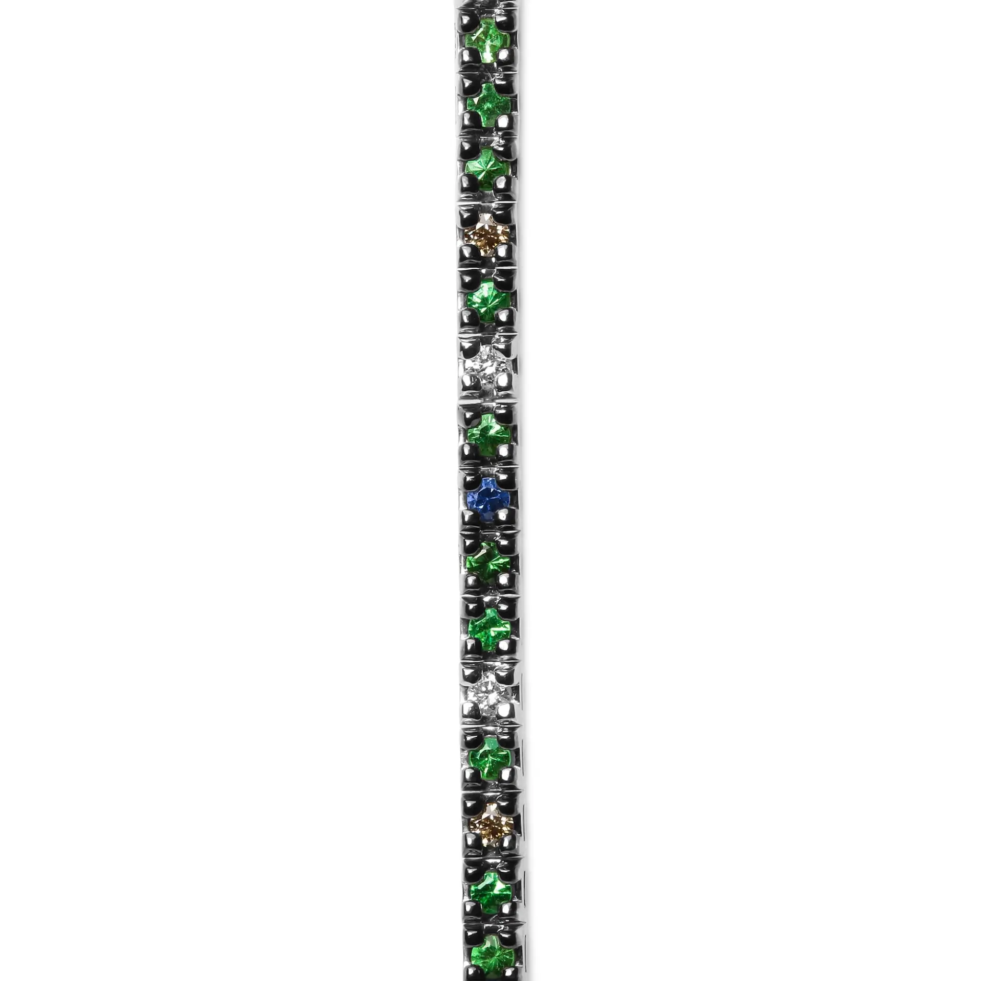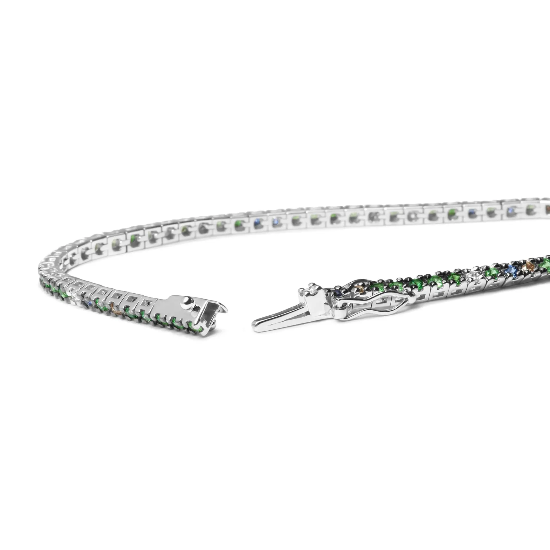 This 18k white gold tennis bracelet is a stunning piece that is perfect to pair with any outfit choice. An array of colorful diamonds and gemstones enhance the look and give it a unique flair that you will love to show off. Round white diamonds and heat-treated brown diamonds dazzle from prong settings alongside natural 1.8×1.8mm round blue sapphire and 1.8×1.8mm round green tsavorite gemstones in prong settings. Gemstones are treated for an enhanced color. The natural diamonds total 3/8 cttw with an approximate Brown and G-H Color with SI1-SI2 Clarity. This lovely bracelet fastens securely with a box with clasp. It is 7 inches long, best for small and medium sized wrists. A colorful twist on a classic style!