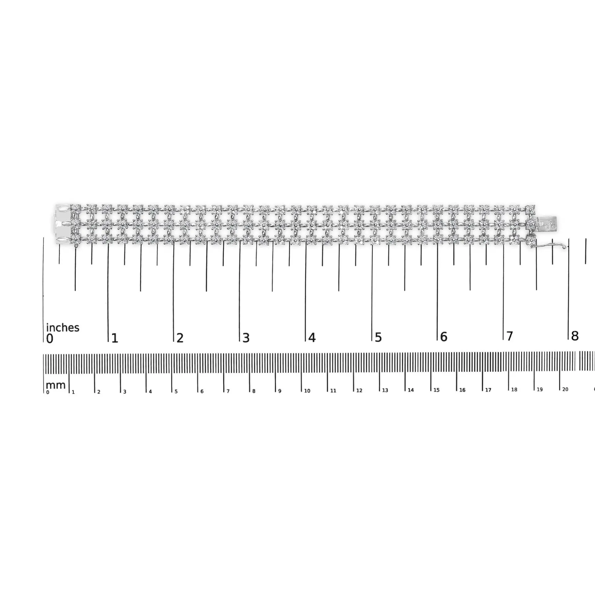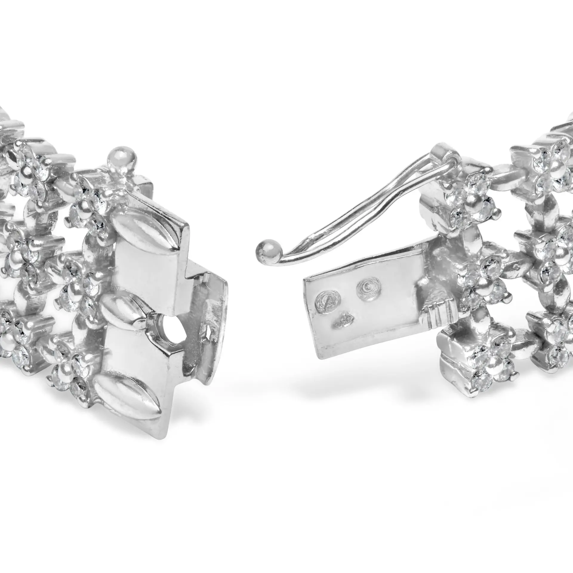Exuding sophistication and craftsmanship, this breathtaking bracelet is finely wrought from 18k white gold, enhanced by a shimmering rhodium plating for extraordinary shine. Encrusted with a lavish 7 1/2 carats of natural diamonds, it boasts a G-H color and VS1-VS2 clarity, ensuring a scintillating cascade of light with each movement. The three-row floral link design intertwines elegance with botanical grace, perfect for adorning the wrist up to 7 inches. A secure box clasp with a safety latch promises peace of mind. This piece is not just jewelry; it is a testament to luxury, designed to enchant and captivate, ensuring you leave a sparkle wherever you go.
