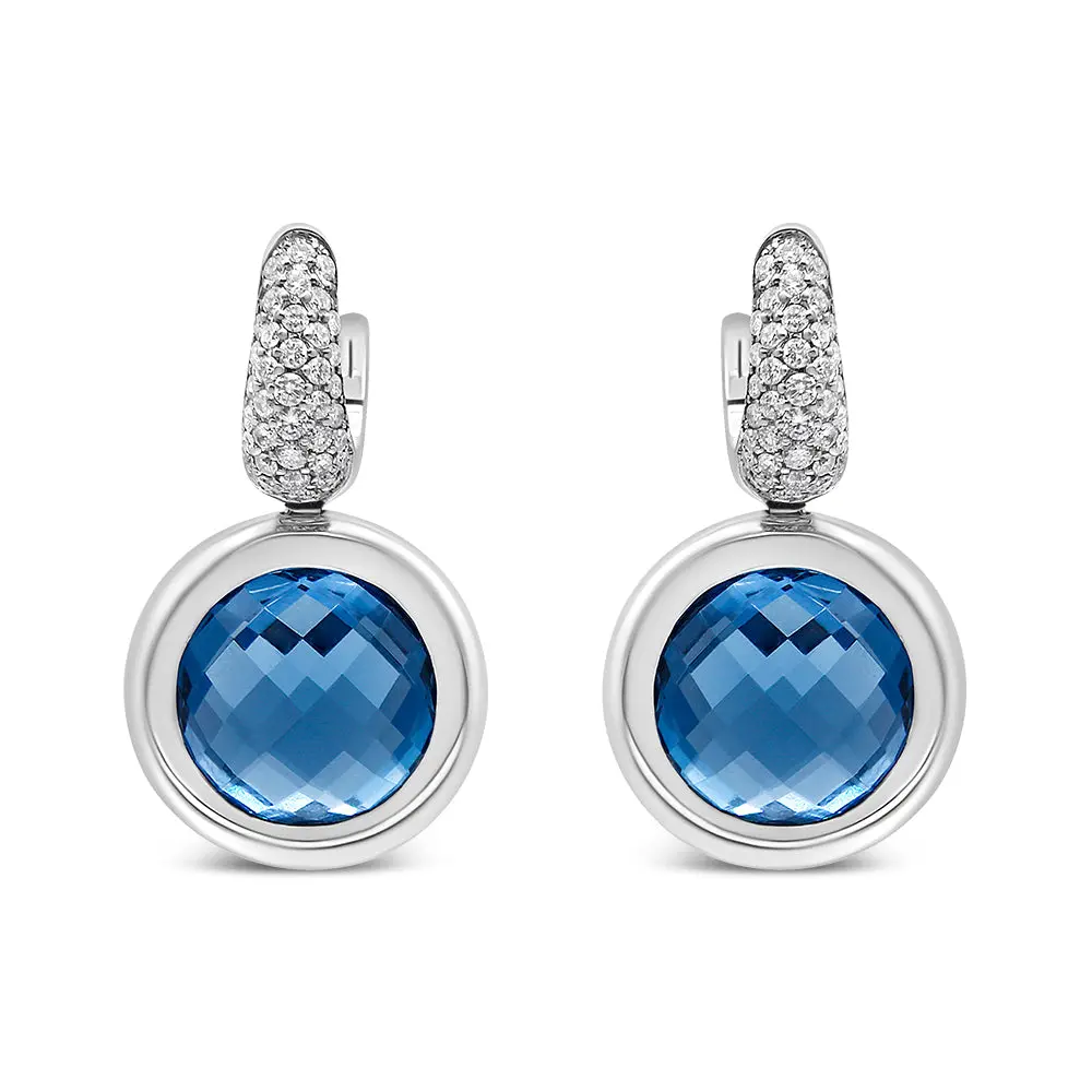 Infuse some blue hue to your attire with these gorgeous diamond and blue topaz drop earrings. Fashioned from luxurious 18K karat white gold, these earrings feature two stunning 11 mm round shaped checkerboard cut natural blue topaz gemstones in an elegant bezel setting. These blue topaz stones will dazzle with every step you take. These gorgeous earrings are further accented with invisible diamonds in the bale for added sparkle. Secured with lever back closures these earrings are perfect to celebrate your December birthday.