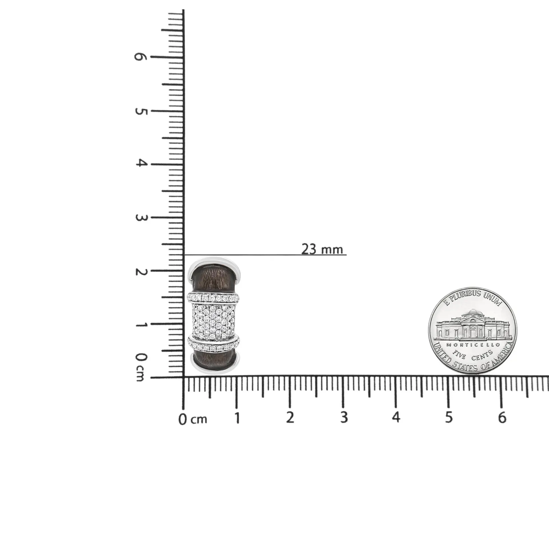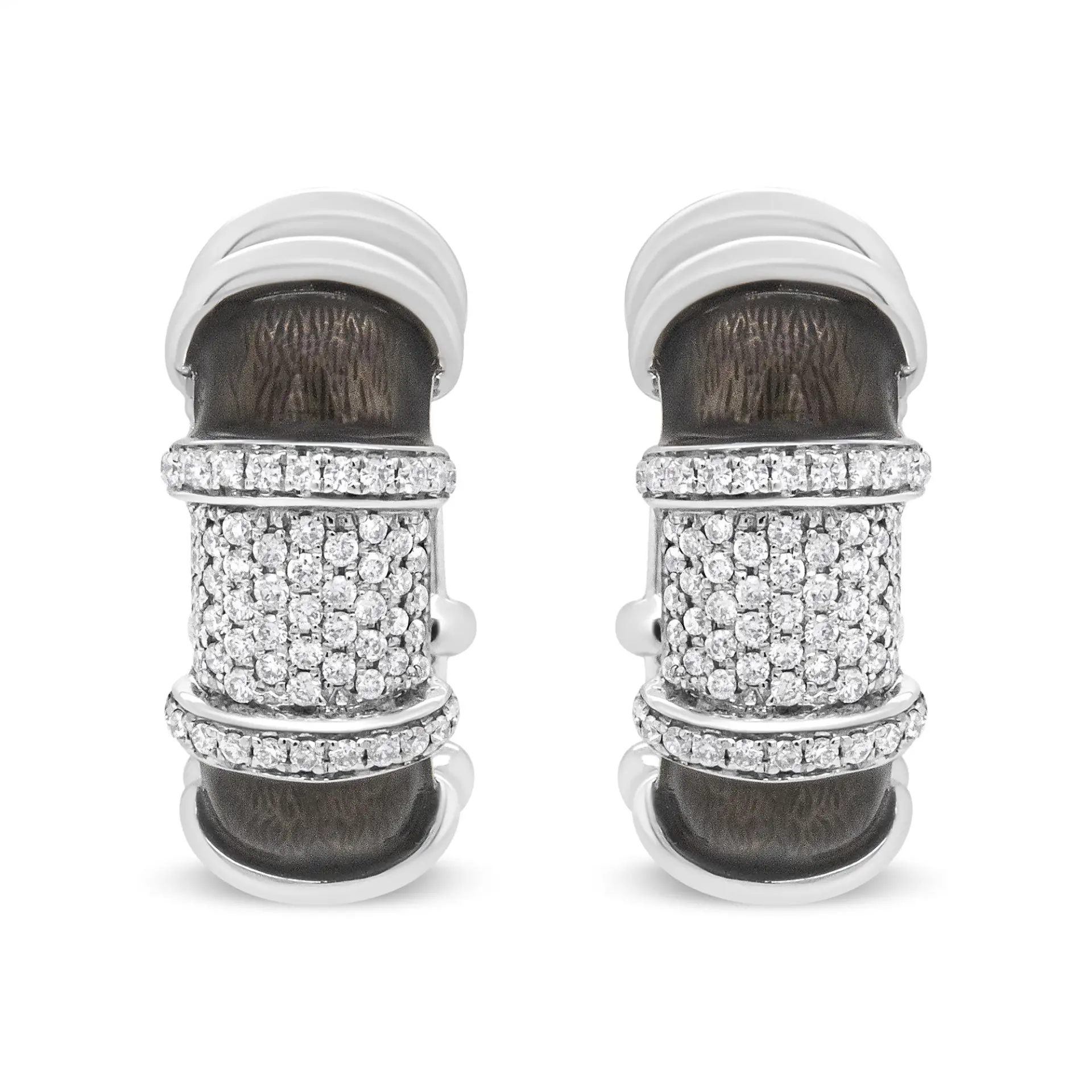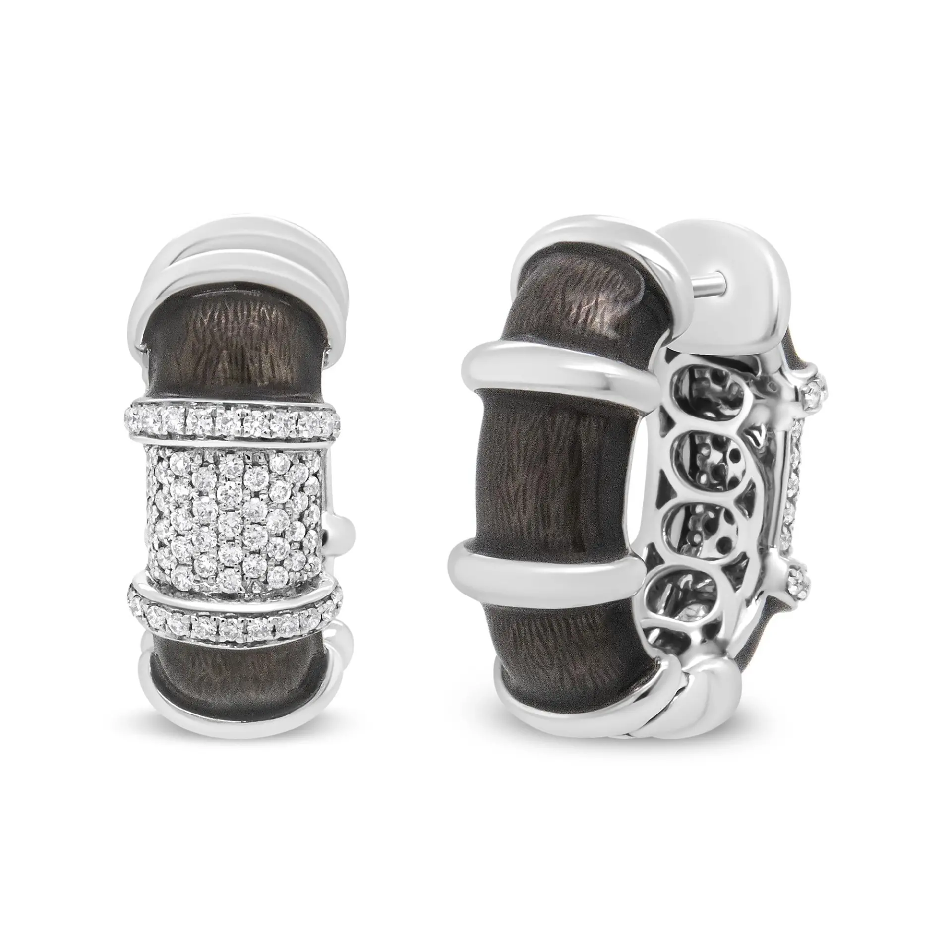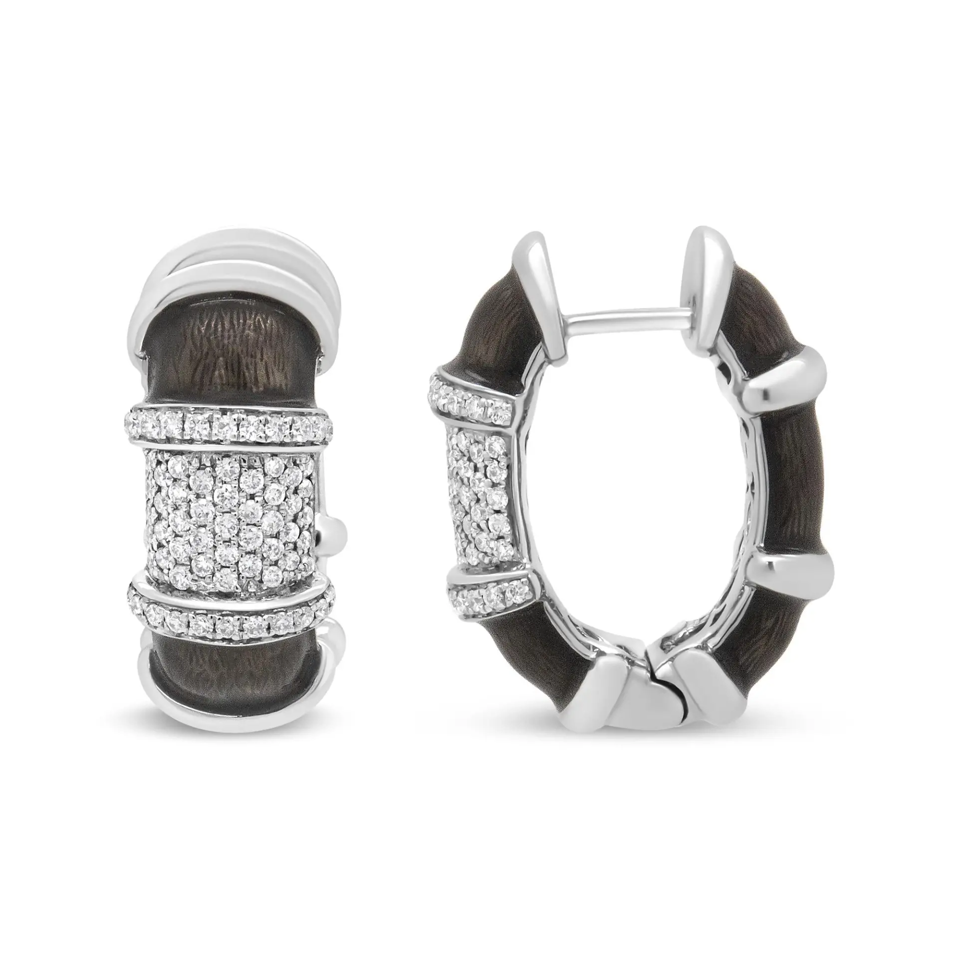 These eye-catching clear graphite grey enamel earrings are made from 18k white gold flash plated .925 sterling silver with sparkling prong-set round diamonds that adds a touch of sparkle to whatever you are wearing. A unique motif of metalwork brings a distinctive flair to these huggie hoops, allowing the rich colors to show through in all their brilliance. At the center, rows of diamonds flash, shimmer, and shine their captivating beauty in a total 5/8 cttw with an approximate F-G Color and VS1-VS2 Clarity. Latch findings keep these pierced earrings safe and secure on the ears for comfortable, worry-free all day wear.