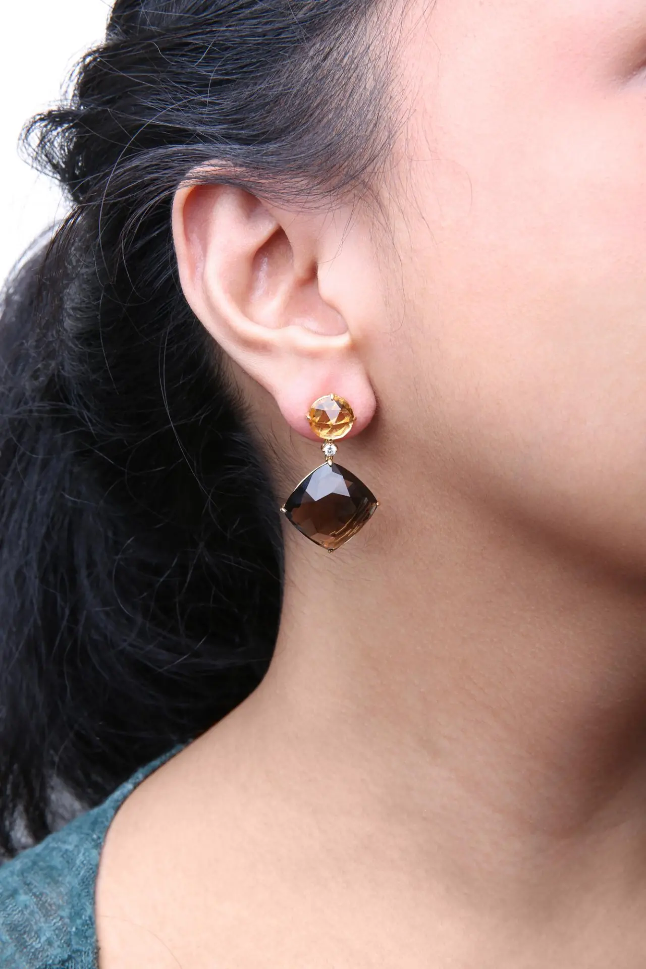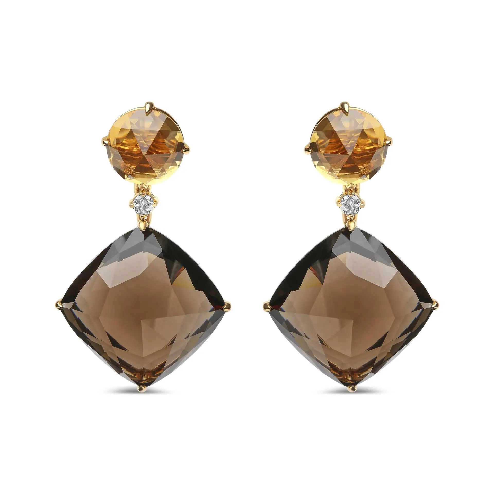 These statement 18k yellow gold dangle earrings are ready to elevate your wardrobe with their sparkling wealth! Mounted in 4-prong settings, natural 10x10mm round heat-treated yellow citrine gemstones shine brilliantly in a checkerboard cut in each earring. Singular round white diamonds shine on in prong settings directly below the citrines. The 25mm cushion-cut heat-treated smoky quartz gemstones complete a ravishing look and attract attention with their distinctive beauty. The diamonds total 1/5 cttw with an approximate G-H Color and SI1-SI2 Clarity. Push back findings secure these pierced earrings comfortably in the ear.