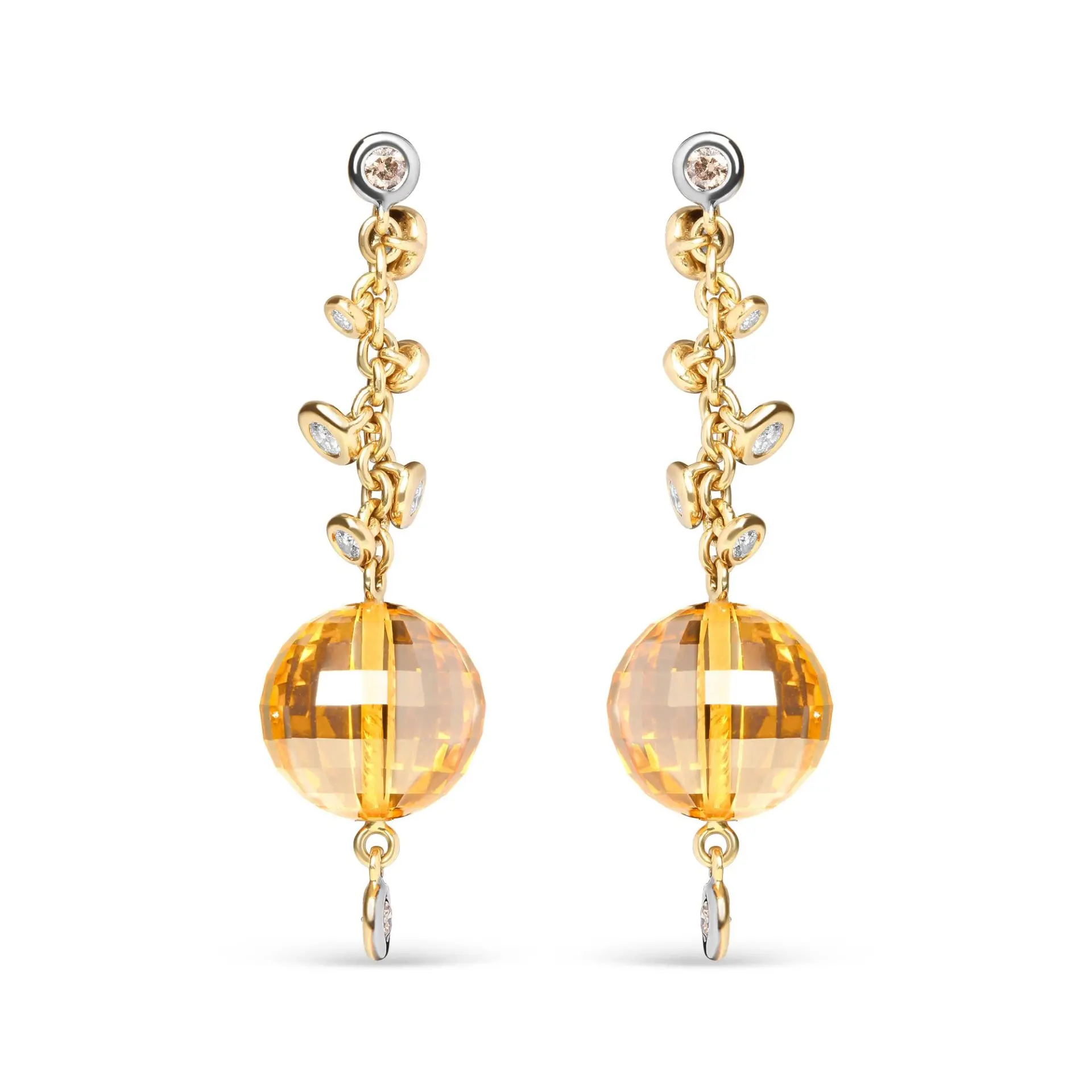 These 18k yellow gold dangle earrings possess a great movement that twinkles in the light as you move about and flash your style. Stationed at the top of the upper dangle and at the very bottom are two round heat-treated brown diamonds within secure bezel settings. The chain dazzled with round white diamonds likewise nested within a secure bezel setting. A heat-treated yellow 25mm ball citrine gemstone completes the look in a drilled setting. The diamonds total 2/3 cttw with an approximate Brown and G-H Color with SI1-SI2 Clarity. Push back findings secure these pierced earrings in your ear for safe all day wearing.