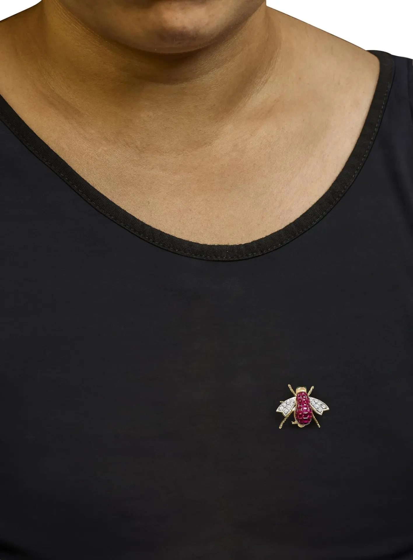 Crafted from opulent 18K yellow gold, this captivating bumblebee brooch pin evocatively pairs nature’s splendor with artisanal magnificence. Enveloped in 6 3/4 carats of vivid, color-treated red rubies, its body glimmers with an intense radiance, while the meticulously invisibly set stones ensure a sleek, unblemished continuity. The wings dazzle with 3/8 carats of natural diamonds, pave-set in rhodium plated gold to accentuate their F-G color and VS2-SI1 clarity, casting an ethereal sparkle. Green, naturally oiled emeralds serve as the bee’s inquisitive eyes, set in stark contrast against its fiery body. With polished gold legs and delicately formed antennae adding a sculptural finesse, this brooch resonates with those who cherish a blend of luxury, creativity, and a touch of whimsy in their adornments.
