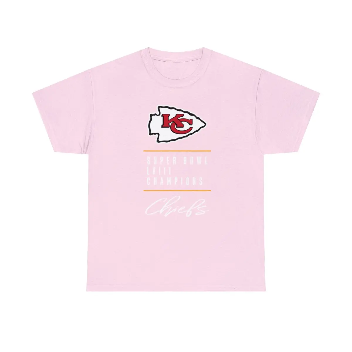 • Design: Featuring bold “2024 Super Bowl LVIII Champions” graphics, this tee is a testament to the triumph and spirit of the winning team. The relaxed fit and crew neck design ensure a timeless look for any gender.