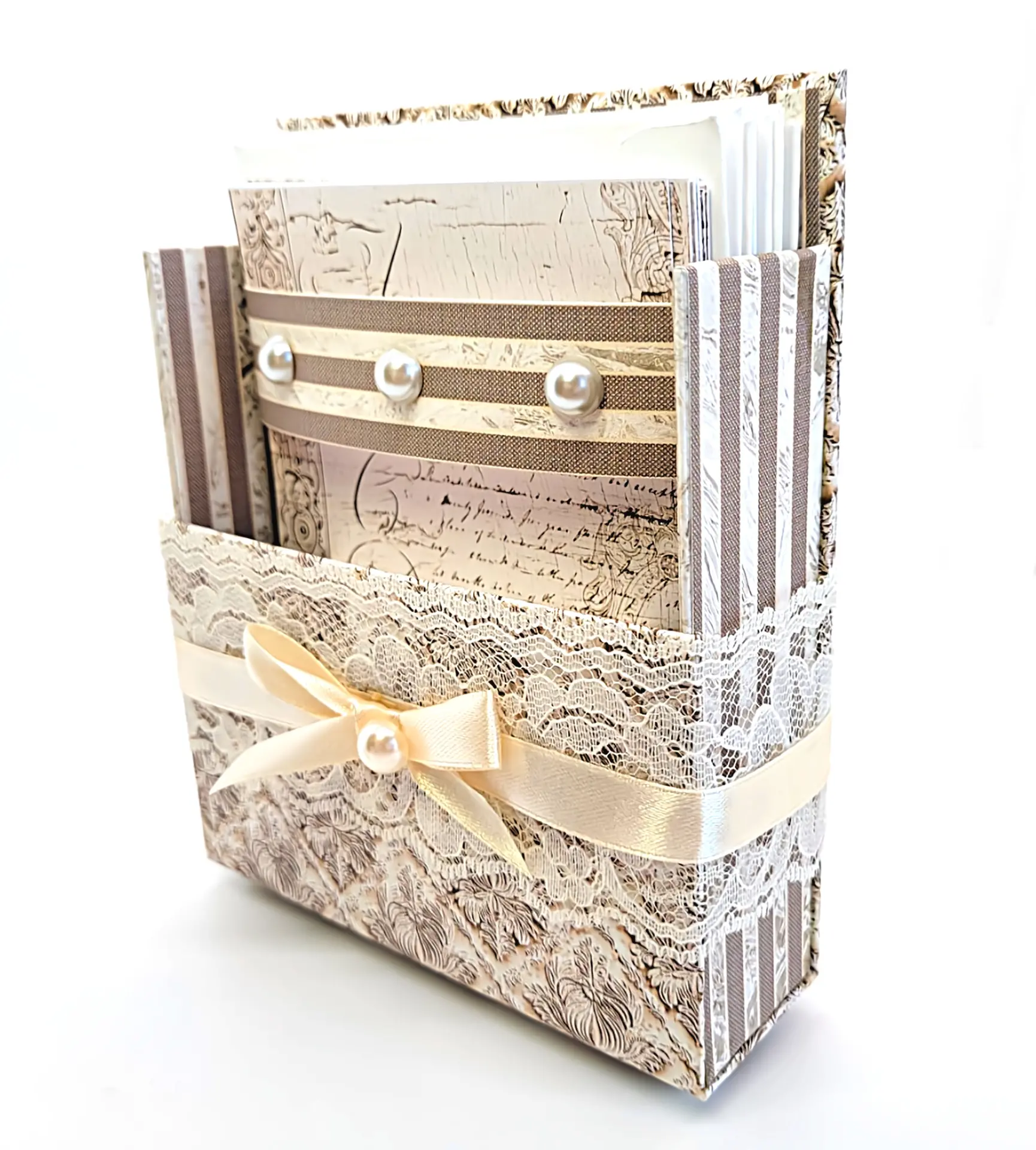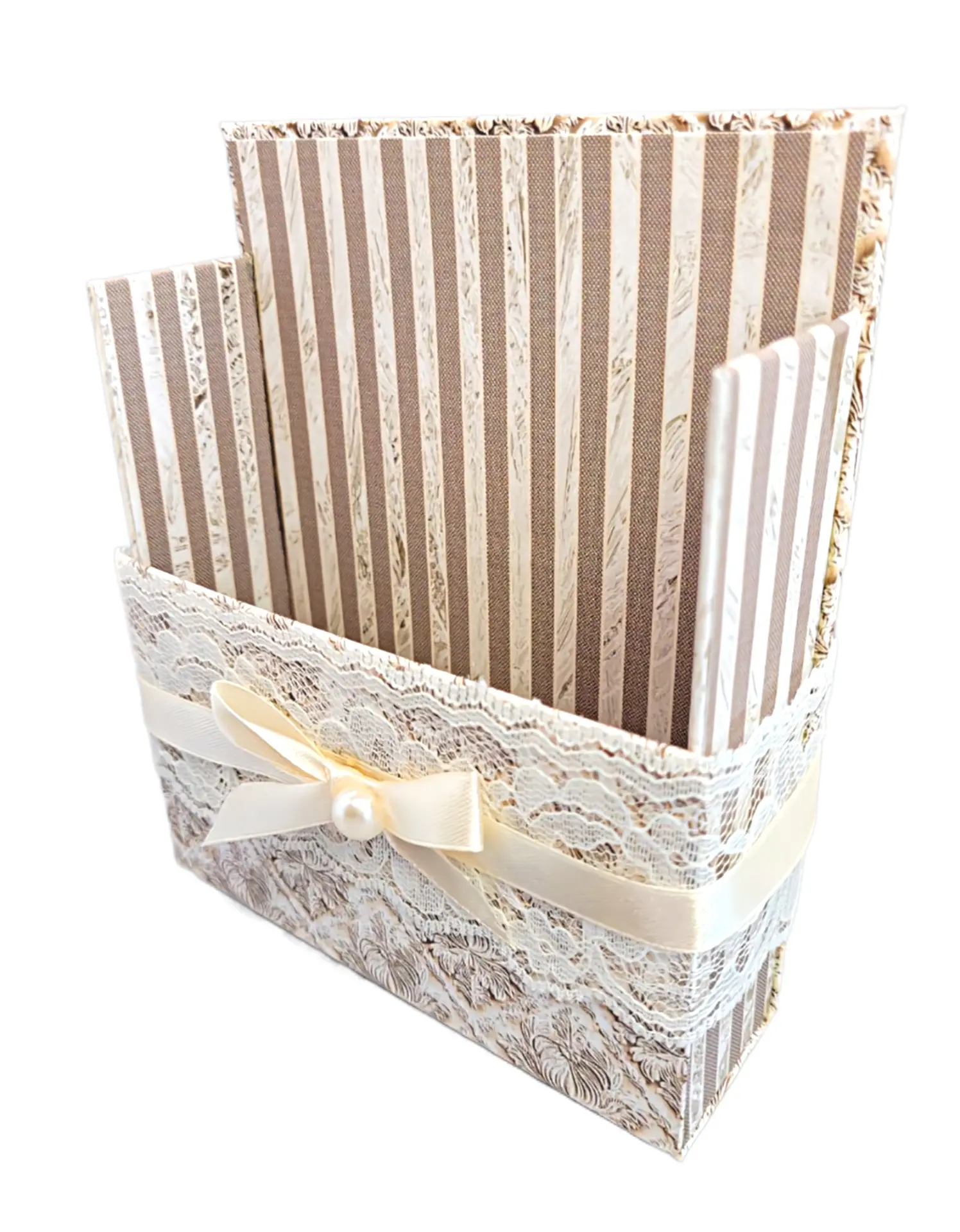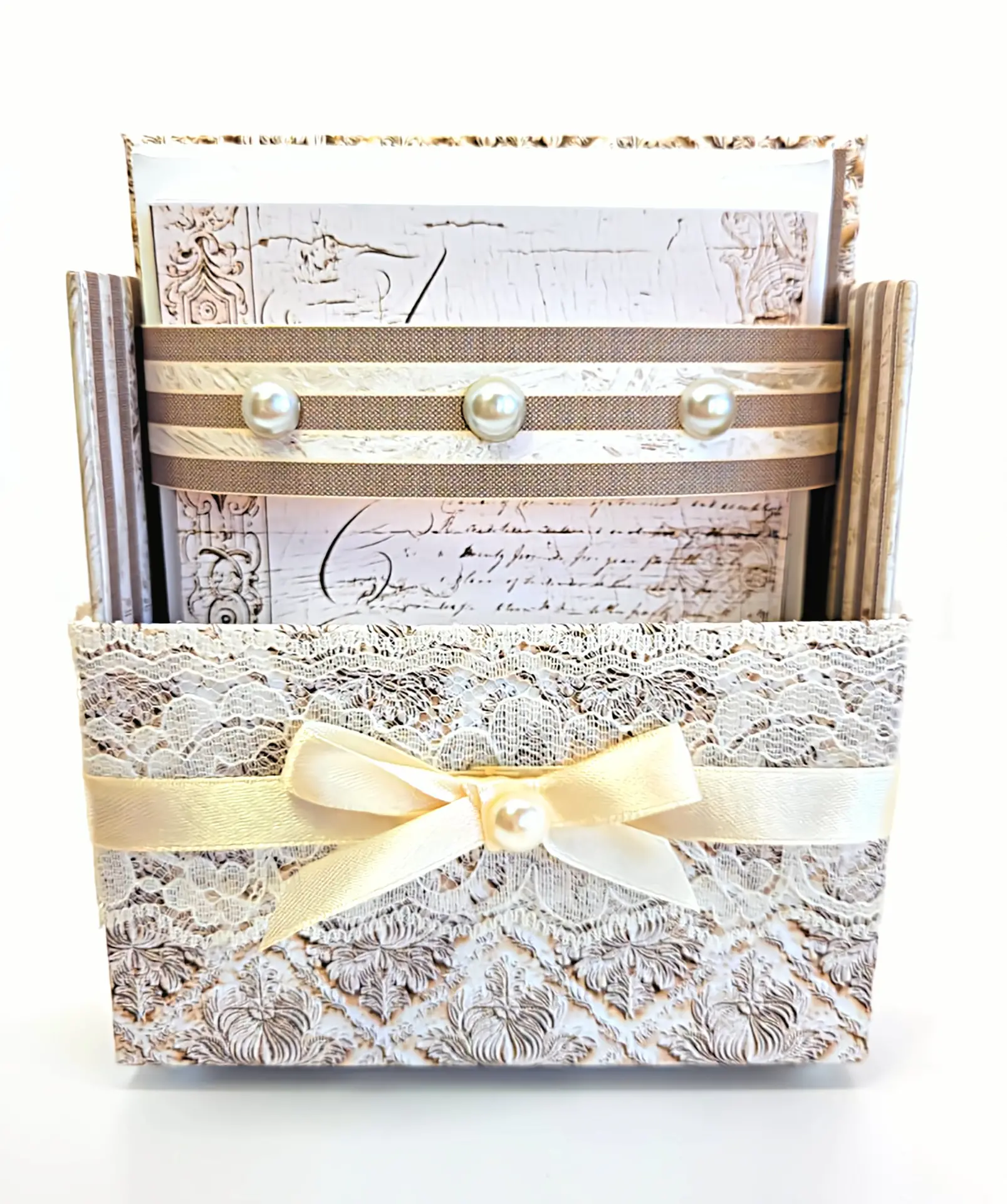 42-Pc Stationery Gift Box Set w/Reusable Desktop Organizer Box and Gold Pen – Vintage Letters & Ivory Lace