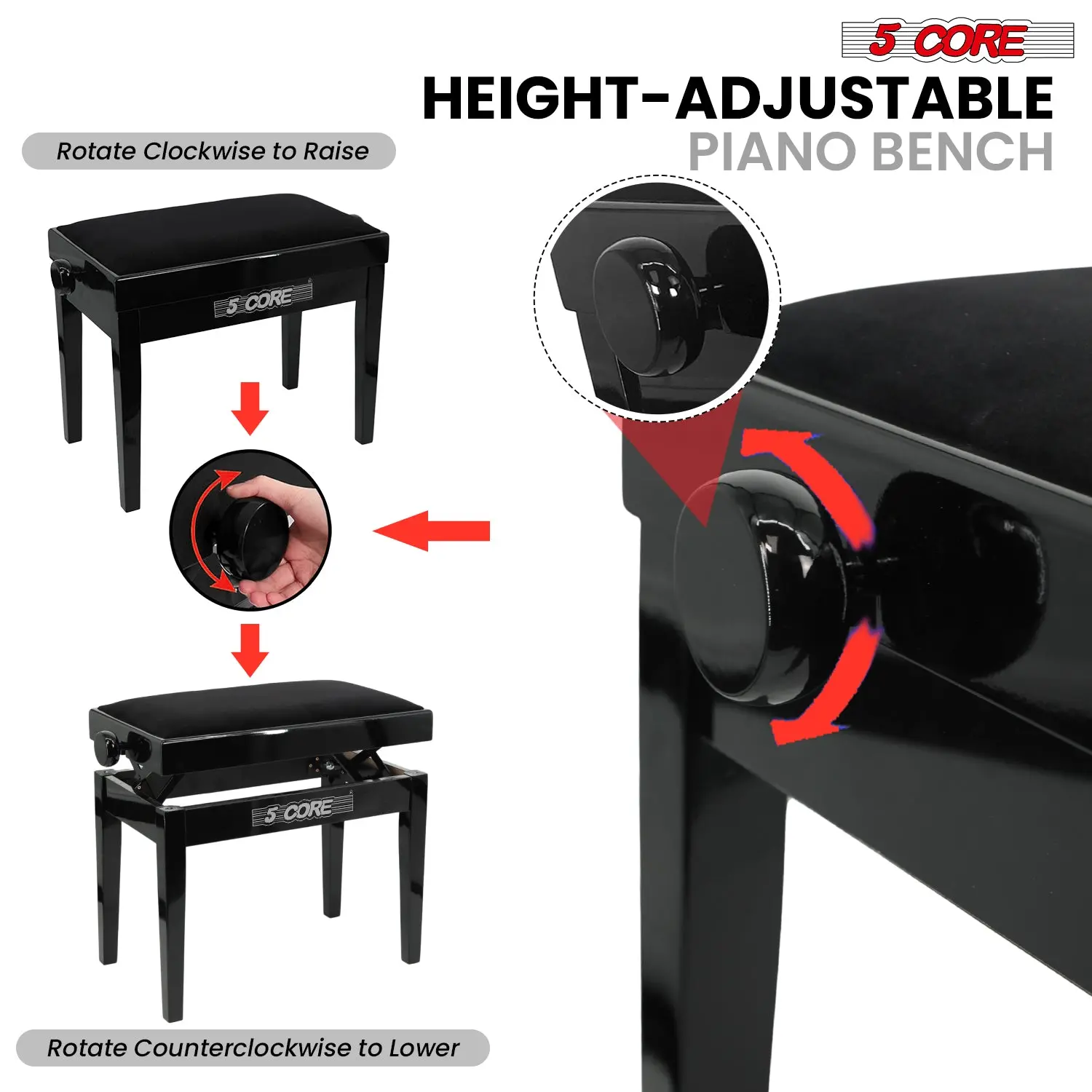 5 Core Adjustable Piano Bench Thick 3.25″ Solid Wood Keyboard Stool Heavy Duty Musician Chair