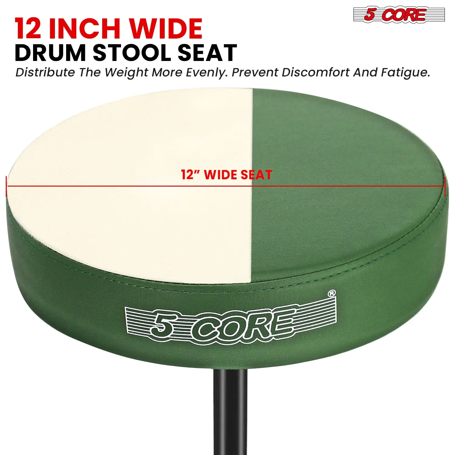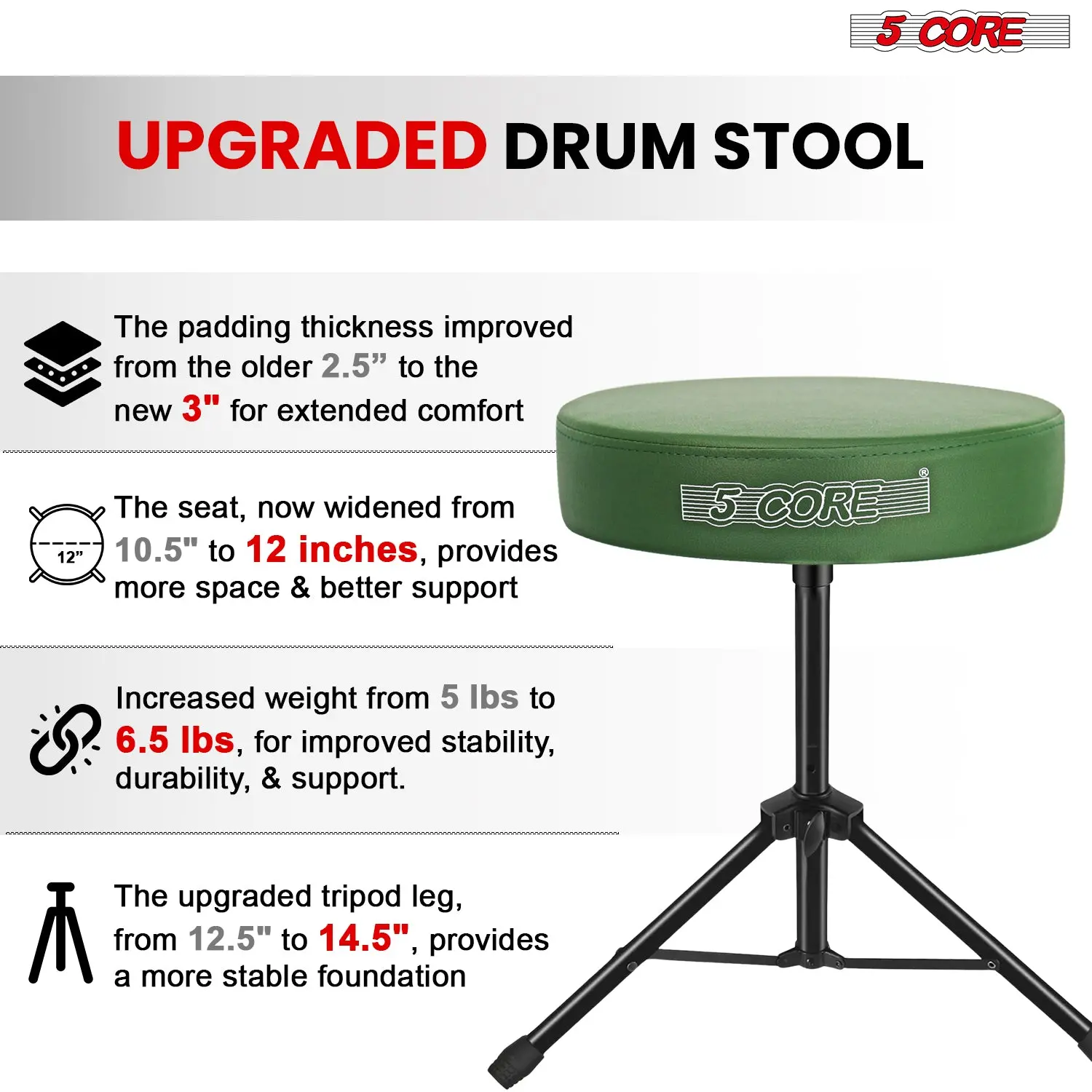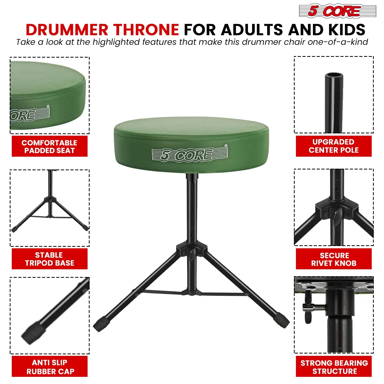 Experience unmatched performance with the 5 Core drum throne. Its 3 inch thick, 12 inch wide padded seat provides lasting comfort for long drumming sessions. This adjustable drum throne seat ranges from 17 to 24 inch, ensuring perfect playing position. The professional drum throne supports up to 330 lbs, making it ideal for both adults and kids. The anti-slip rubber-capped drum throne tripod legs offer superior stability on any surface. Versatile in use, this drummer chair can be used as a music stool, DJ seat, guitar stool, and more. Easy to install and portable, it features a collapsible design. Enjoy reliable & comfortable performance with sturdy metal safety pin and a high-density sponge cushion, making it the perfect drummer throne for any setting. |