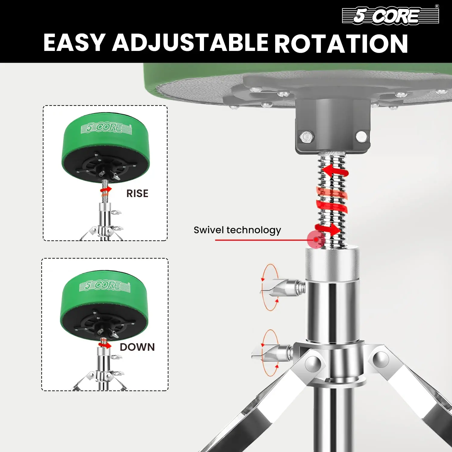 It allows 360-degree rotation for easier access to different parts of the drum kit and offers position adjustments without the need to stand up. |