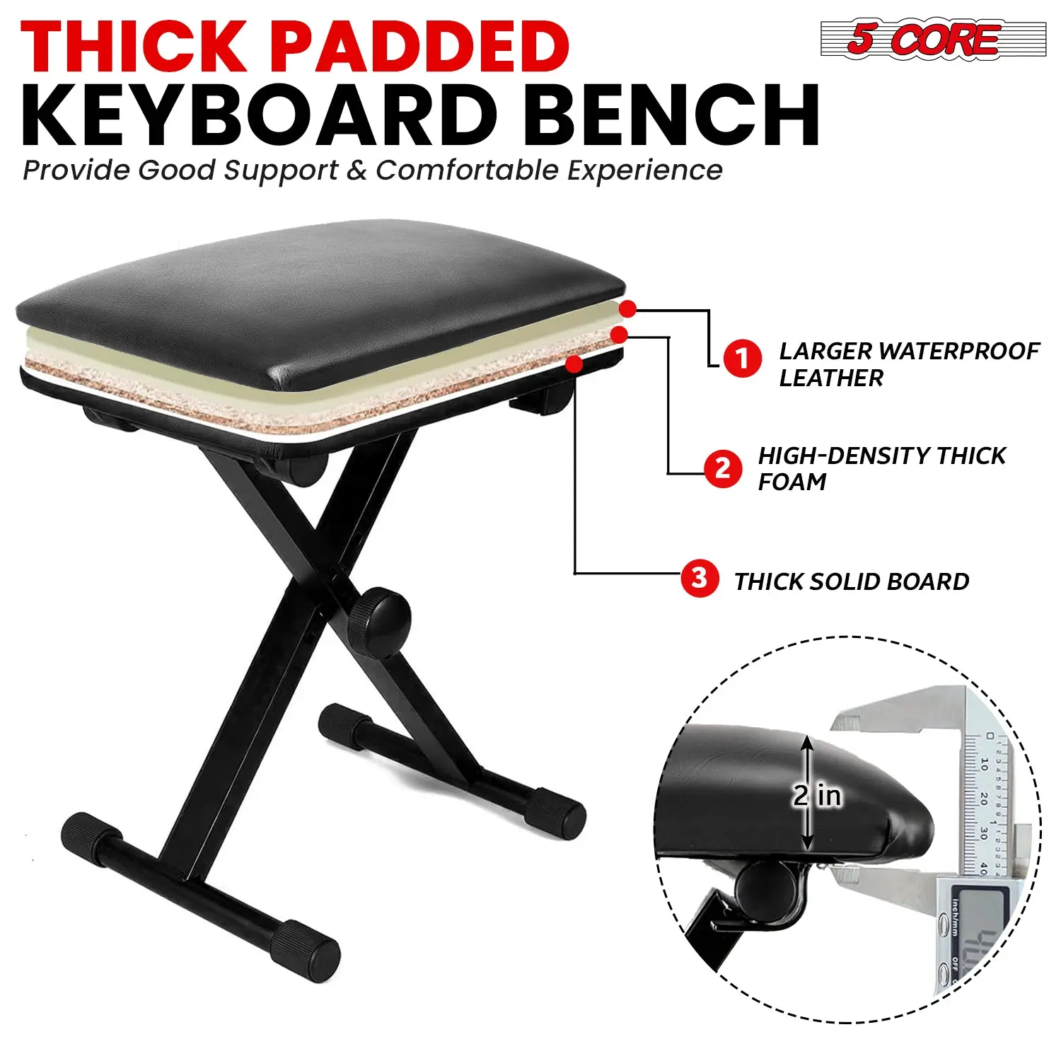 Comfortable Seating The keyboard bench features a 2 inch thick padded seat, offering great comfort for long practice or performance sessions.