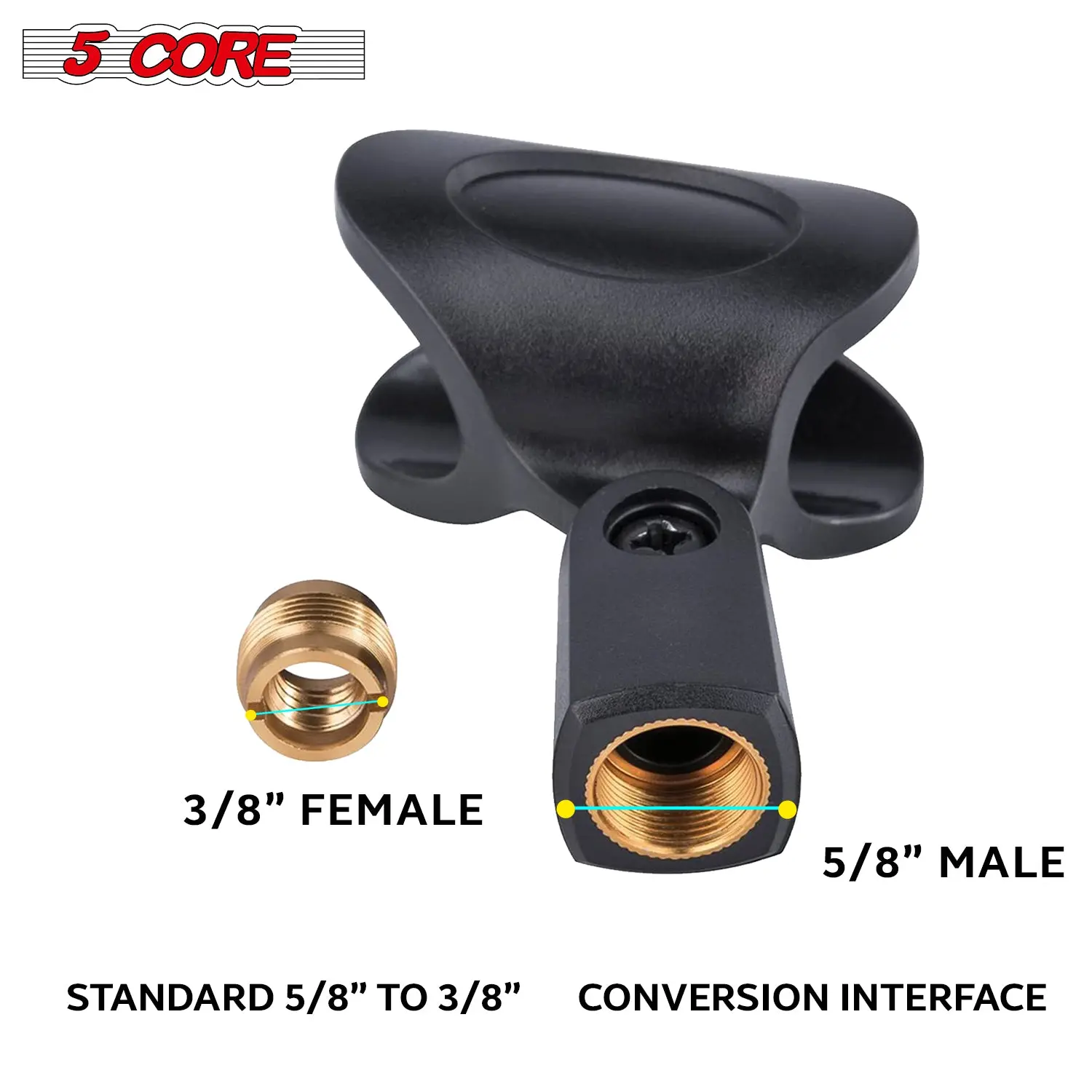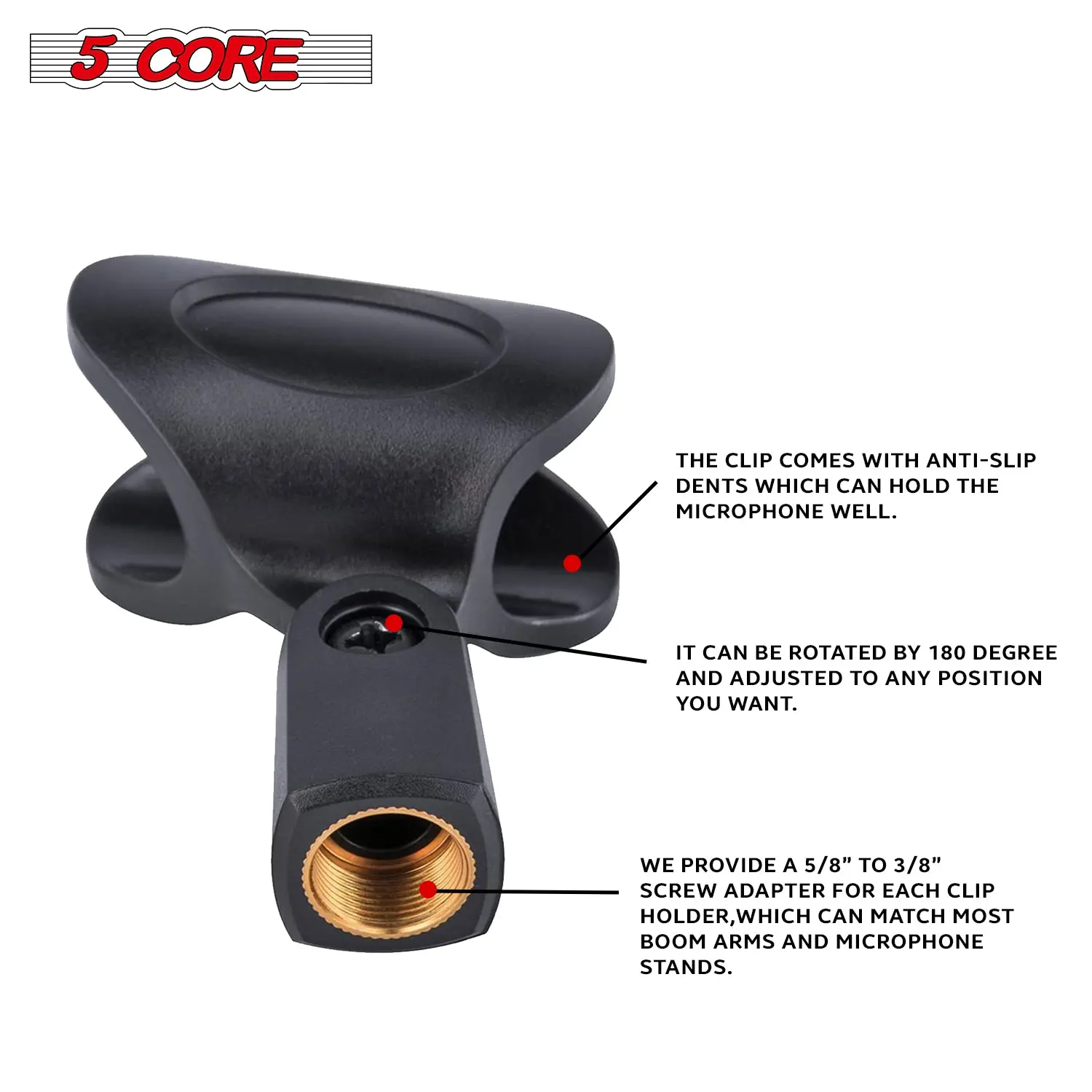 | Standard 5/8 to 3/8 threaded nut, it’s simple and straightforward to attach to any standard microphone stand or boom arm. | The mic clip has a firm grip, designed to hold your microphone securely in place, preventing any accidental drops. | Compact and lightweight, ideal for those on the go, our clip holder is lightweight and easy to transport. | A unique texture inside the mic clip ensures your microphones will not slide off or lose their grip. |