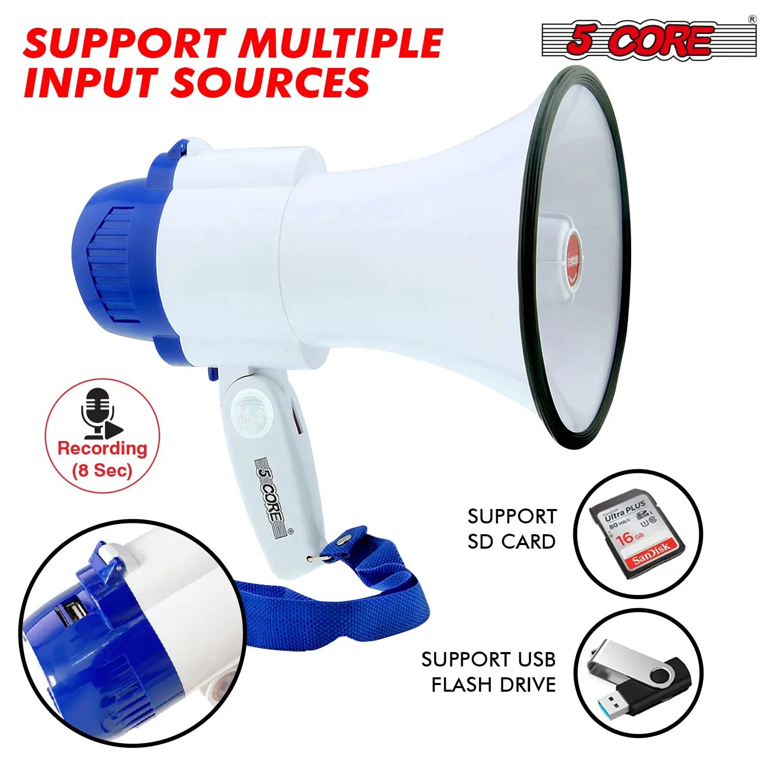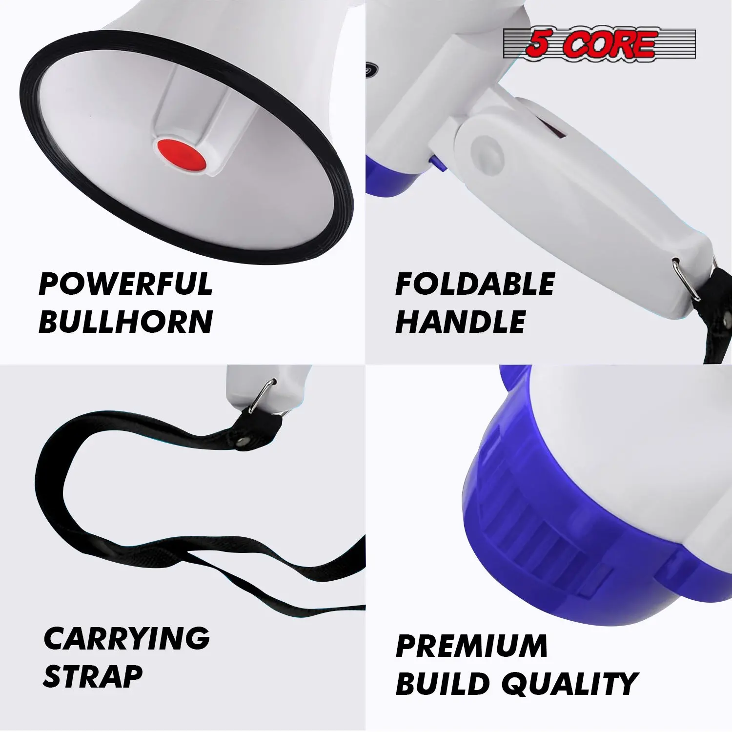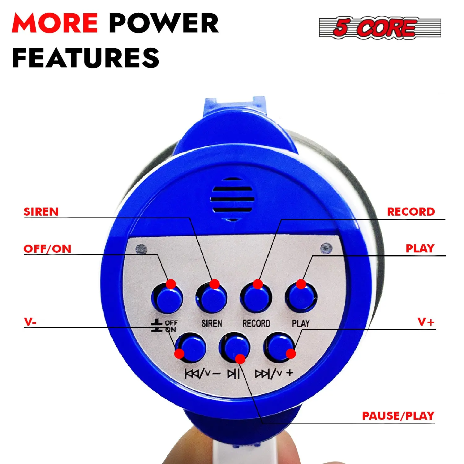 5 Core professional loud megaphone, designed to make your voice heard with clarity and precision! Delivers a robust 30W of power, ensuring your message carries across any crowd. Easily adjust the volume to suit your needs and record up to 8 seconds of your speech for repeated playback. Activate the alarm/siren mode for emergencies or attention grabbing situations. The built-in mic in the portable loud blowhorn offers versatility in sound projection. With an impressive 800 yard voice projection range, powered by 4 type D batteries (included), this powerful mega phone is your ultimate communication tool for any event or occasion. |