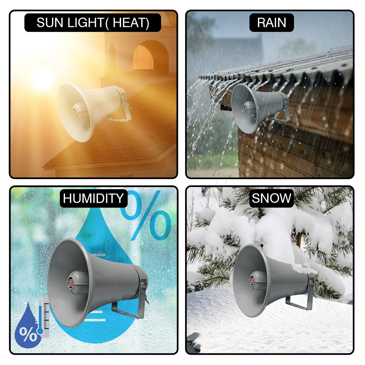 Deliver clear audio across far distances with the loud PA horn, featuring 200W peak and 20W MAX power. Built with a heavy duty ABS structure, this all-weather loudspeaker can withstand severe climates, making it ideal for outdoor use. The outdoor pa systems’ great frequency response of 400 Hz5 KHz ensures speech and music are easily understood. Compatible with most amplifiers, receivers, and audio equipment, thanks to its 8 Ohm impedance, this bocinas de voz para carro integrates seamlessly into your setup. The adjustable bracket allows for flexible positioning, ensuring the perfect fit for your needs. Improve your outdoor announcement with unmatched clarity and durability. |