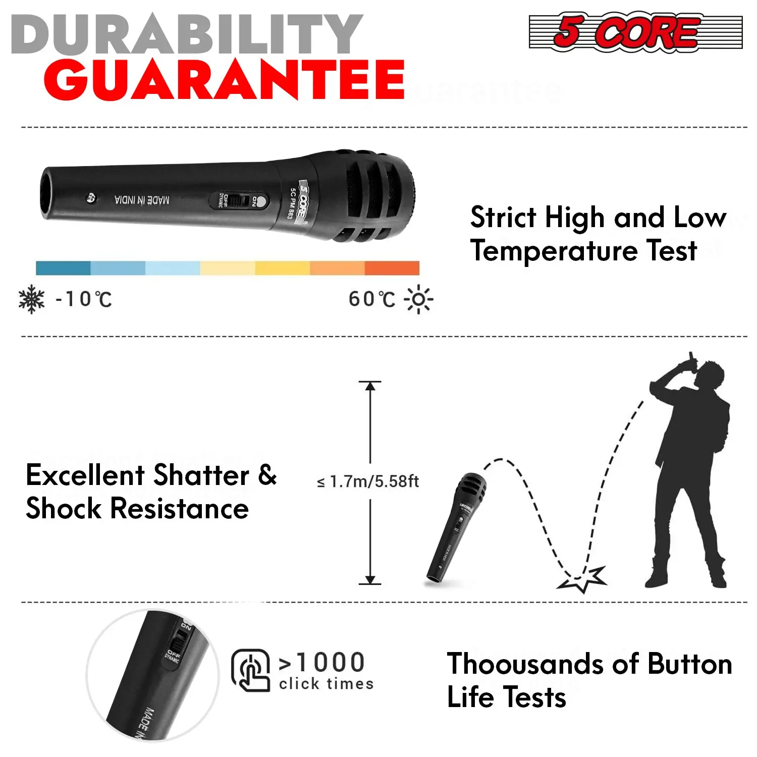 Experience superior audio quality with the 5 Core vocal handheld dynamic karaoke singing mic, designed to deliver brilliant sound reproduction while reducing noise and feedback. The wide frequency response in the dynamic microfono ensures consistent sound pickup from the source and keeps its natural form. You don’t need to do a lot of equalization to get the perfect sound. This is a professional vocal microphone for singing, designed to offer you clarity and amazing sound. A standard wired XLR to 1/4 inch plug connection lets you enjoy reliable performance. There is no latency or radio wave interference. This rugged plastic microphone is made from fresh ABS material with a reinforced steel windscreen to safeguard internal components. Even if you drop the anti-dent ring, keep this microfono safe. Ideal vocal microphone for singing, karaoke, DJ, PA, speeches, and more. This dynamic microphone XLR is your go-to for clear, reliable, and professional performance. |