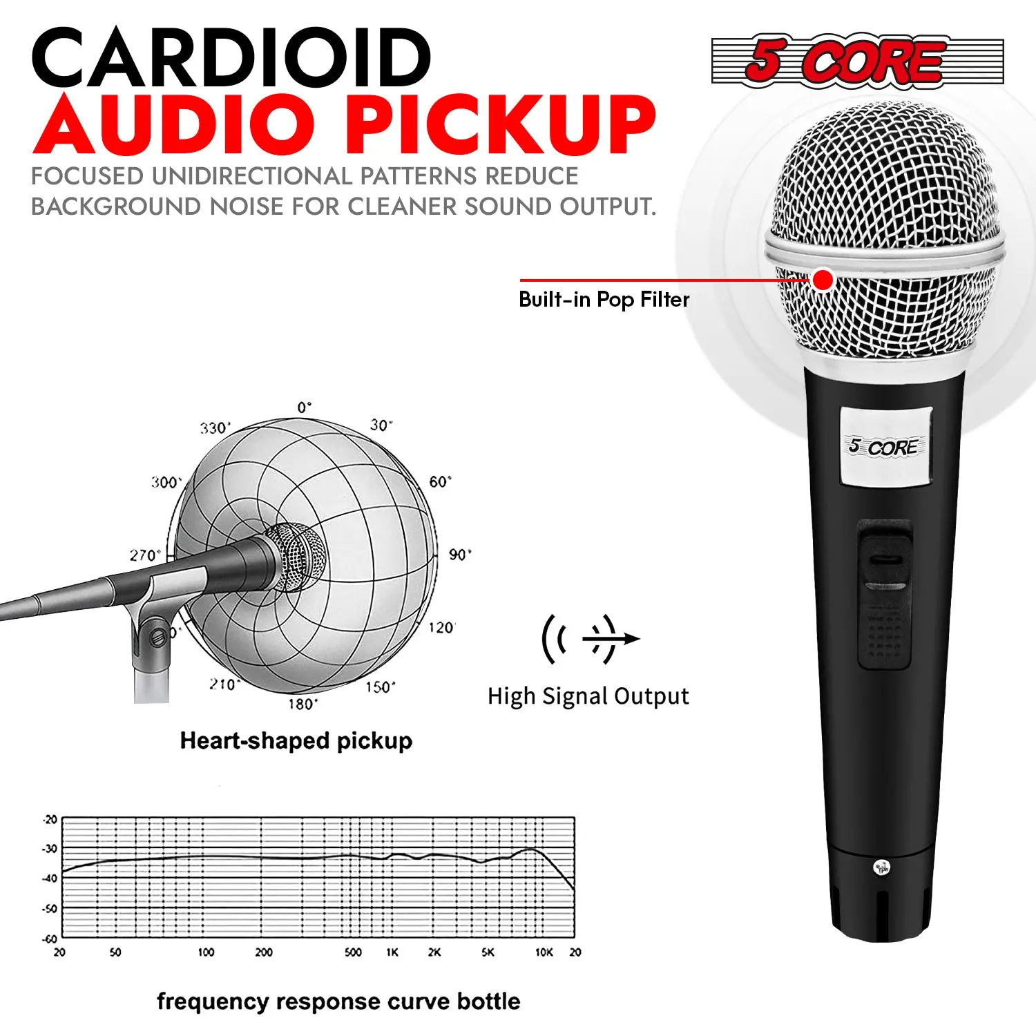 Experience superior audio quality with the 5 Core cardioid karaoke microphone, designed to deliver brilliant sound reproduction while reducing noise and feedback. The wide frequency response in the dynamic microfono ensures consistent sound pickup from the source and keeps its natural form. You don’t need to do a lot of equalization to get the perfect sound. This is a professional vocal microphone for singing, designed to offer you clarity and amazing sound. A standard wired XLR to 1/4 inch plug connection lets you enjoy reliable performance. There is no latency or radio wave interference. This rugged plastic XLR Singing Microfono is made from fresh ABS material with a reinforced steel windscreen to safeguard internal components. Even if you drop the anti-dent ring, keep this microfono safe. Ideal vocal microphone for singing, karaoke, DJ, PA, speeches, and more. This Wired Dynamic Mic is your go-to for clear, reliable, and professional performance. |
