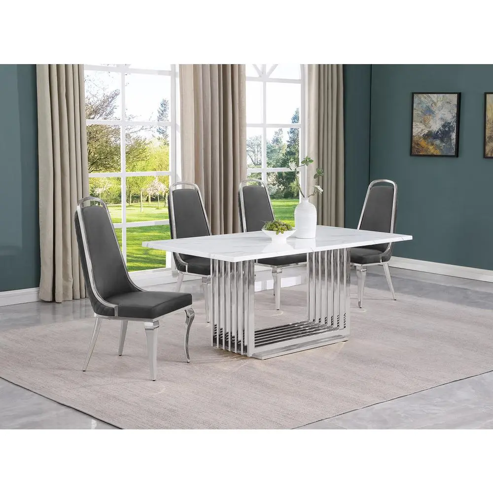 Best Quality presents its new collection of marble dining sets. Featuring this five piece modern style white marble top with silver stainless steel base dining table. Measuring 68″L x 38″W this table is sure to be the centerpiece of any dining room especially when combined with our glam style side chairs which feature decorative diamond stitching on the back rest and silver chrome lining. Assembly is required.