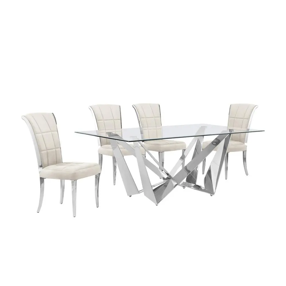 A complete 5 piece dining set with a stunning glass dining table and velvet upholstered side chairs. The dining table features a 12mm clear glass top, screwed into a silver polished stainless steel base with a mirrored finish. The chairs are constructed with a durable iron frame with chrome plating. The chairs feature a square stitching on the backrest and a decorative back ring. Assembly required.