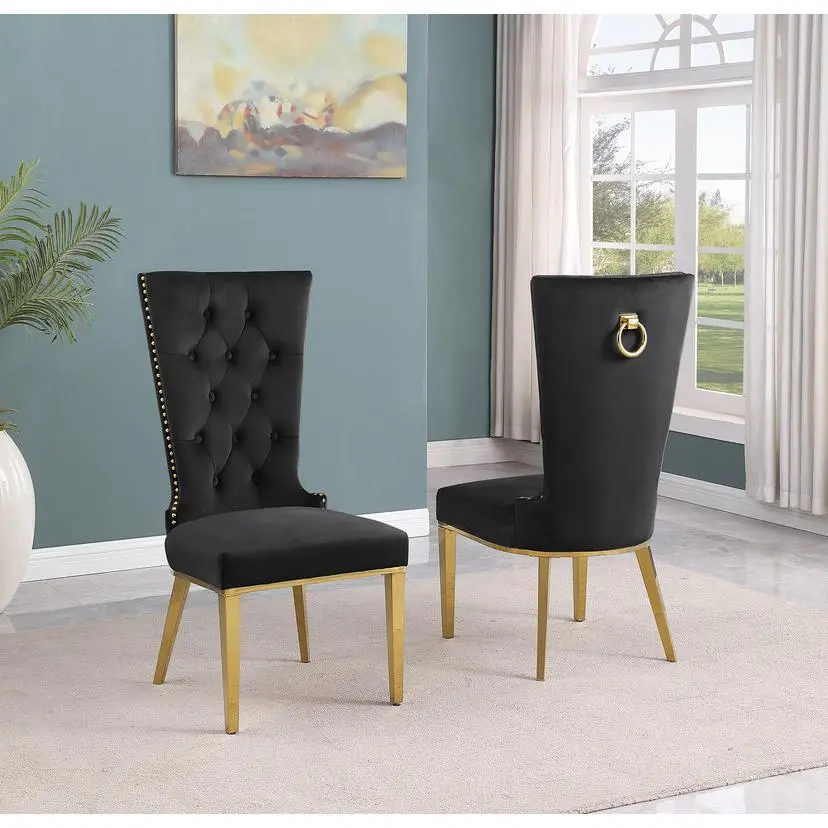 Best Quality Furnitures stunning and modern glam dining set with a white marble dining table, lazy susan, and velvet upholstered side chairs. The table base is polished gold stainless steel with a mirror finish, meanwhile the top is made out of real marble with a removable lazy susan. This set includes 4 matching velvet side chairs with a matching gold polish stainless steel base. These chairs also feature tufted buttons on the tall back rest and a decorative back ring handle. Assembly is required, marble may vary in patterns due to natural circumstances.