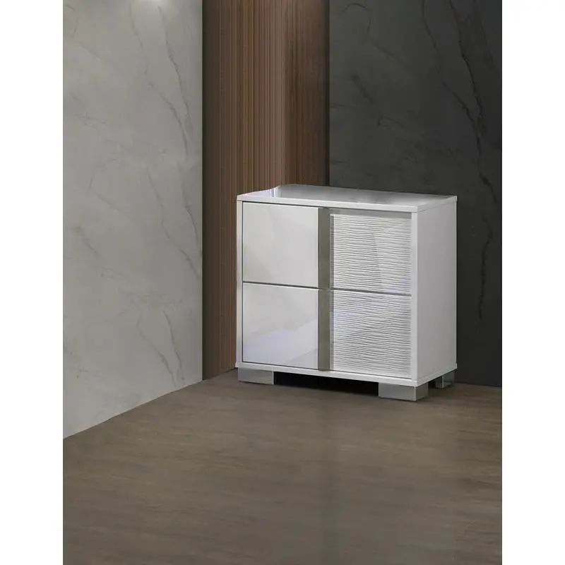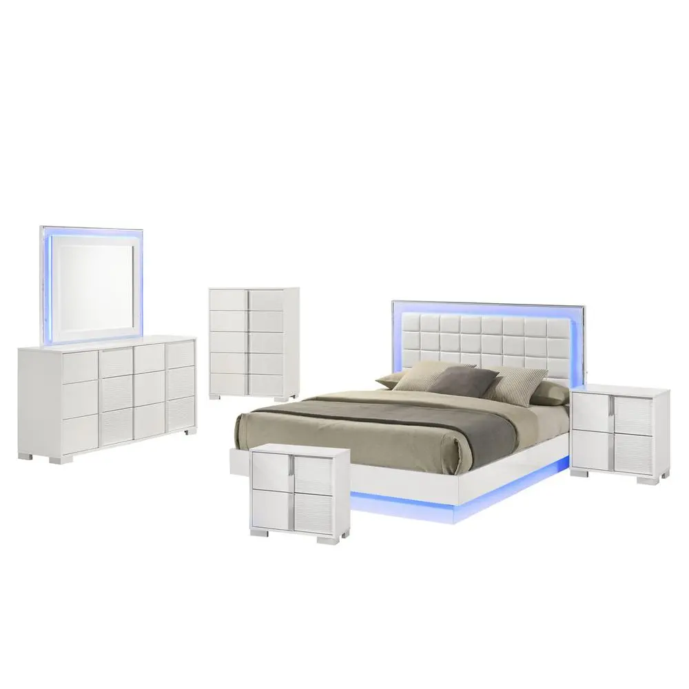 6pc- Eastern king Futuristic bedroom design featuring adjustable LED lighting around the headboared and side rails of the bed. This set includes one platform bed which is deisgned to give the illusion of laying on a “floating” bed. This set includes two white night stand with a light metal contrast and two drawers, one matching dresser with 6 drawers, a dresser mirror which features an adjustable blue LED light to match the one of the bed, lastly, a matching chest with 5 drawers and metal accent. Assembly is requiered for all parts of this set.
