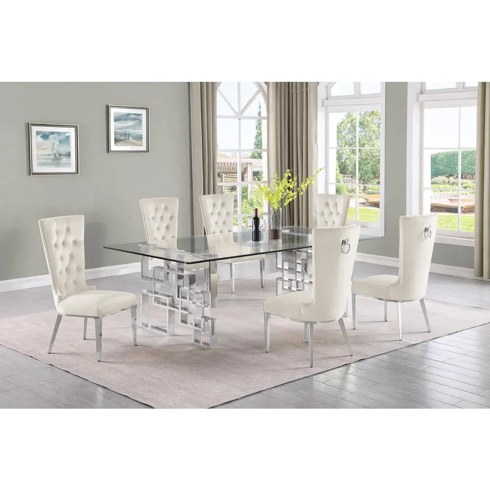 95″ long dining table Tempered glass Polished stainless steel base Polished silver color Velvet fabric Glam style Assembly required