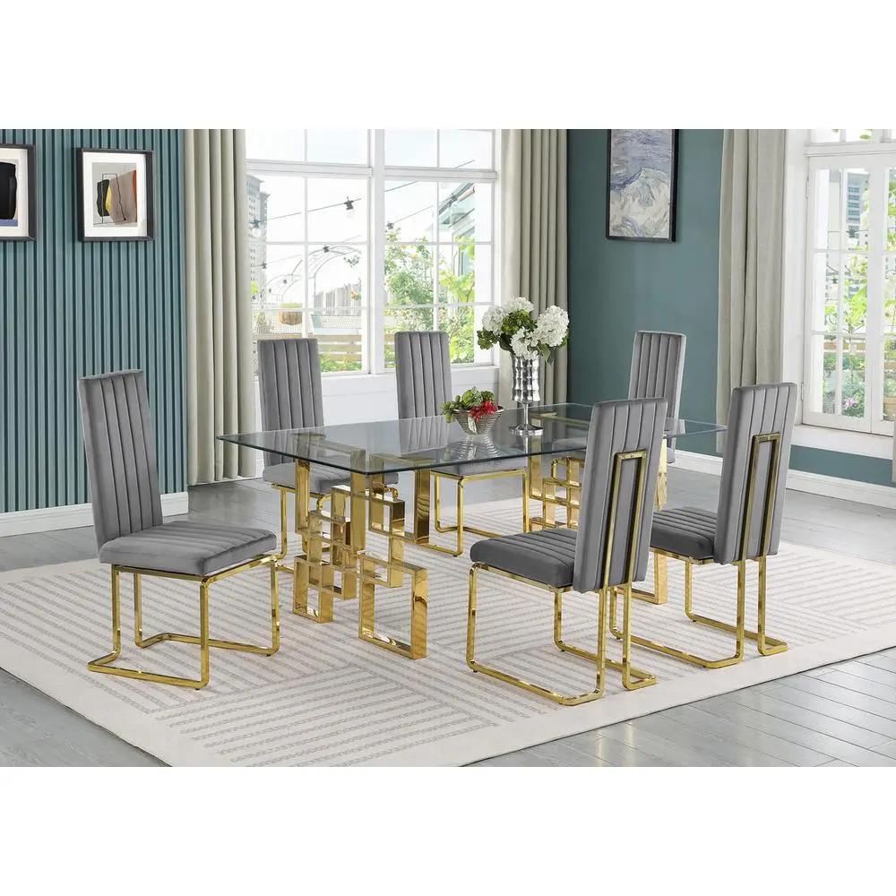 Dining set Tempered glass Gold stainless steel Velvet fabric Gold chrome Long back side chairs Assembly required