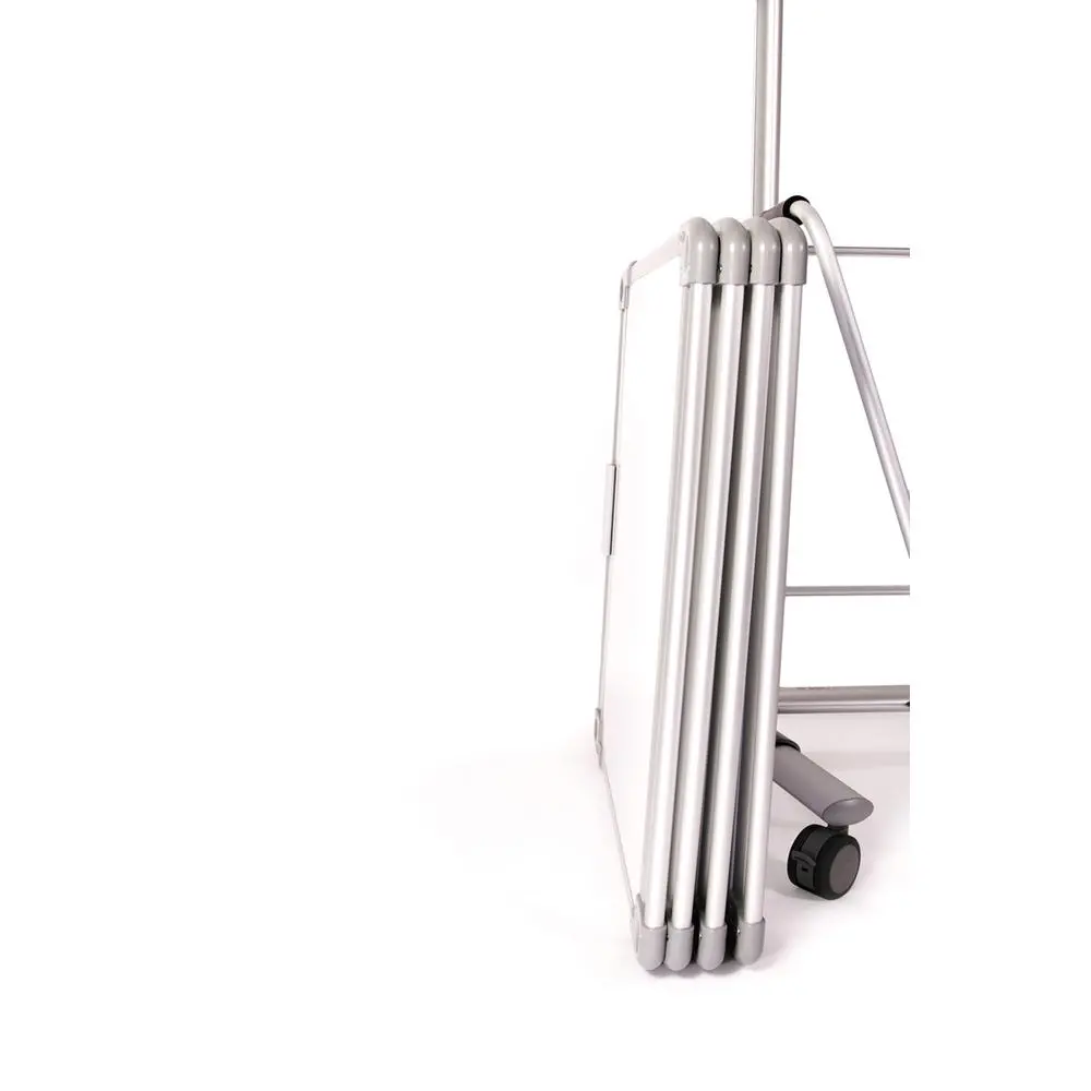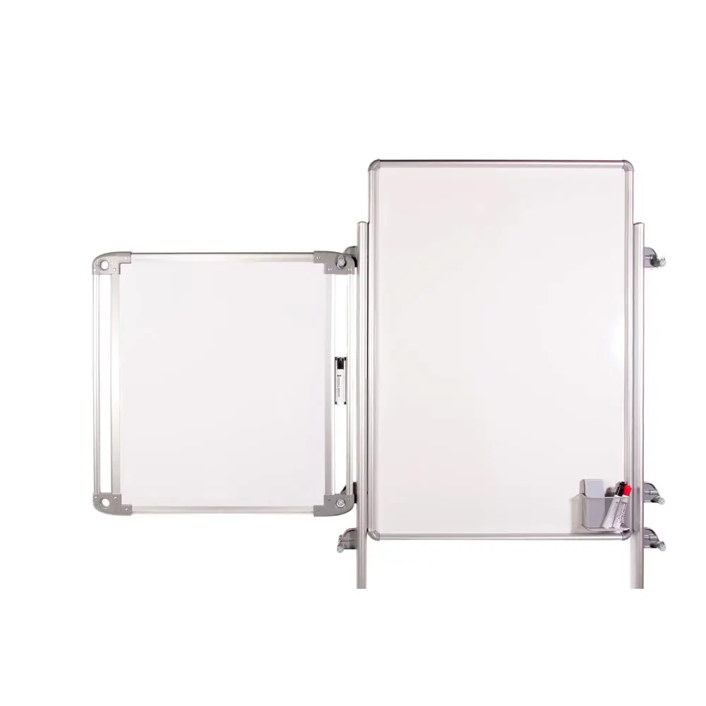 The Nexus Easel is a mobile, double-sided marker board display stand that provides a flexible writing area plus expandable work space for tablets. The double-sided porcelain magnetic marker surface provides a greener solution than chart pads. The workspace is expandable with side pegs that accommodate up to 8 Tablets (included) to give users the most space possible to create and collaborate. Angled foot design allows units to be grouped together for more coordinated collaboration space. Magnetic accessory bin includes 4 markers and 1 eraser. Decorative panel is Frosted acrylic. Made in the USA. Backed with a 10 year warranty.