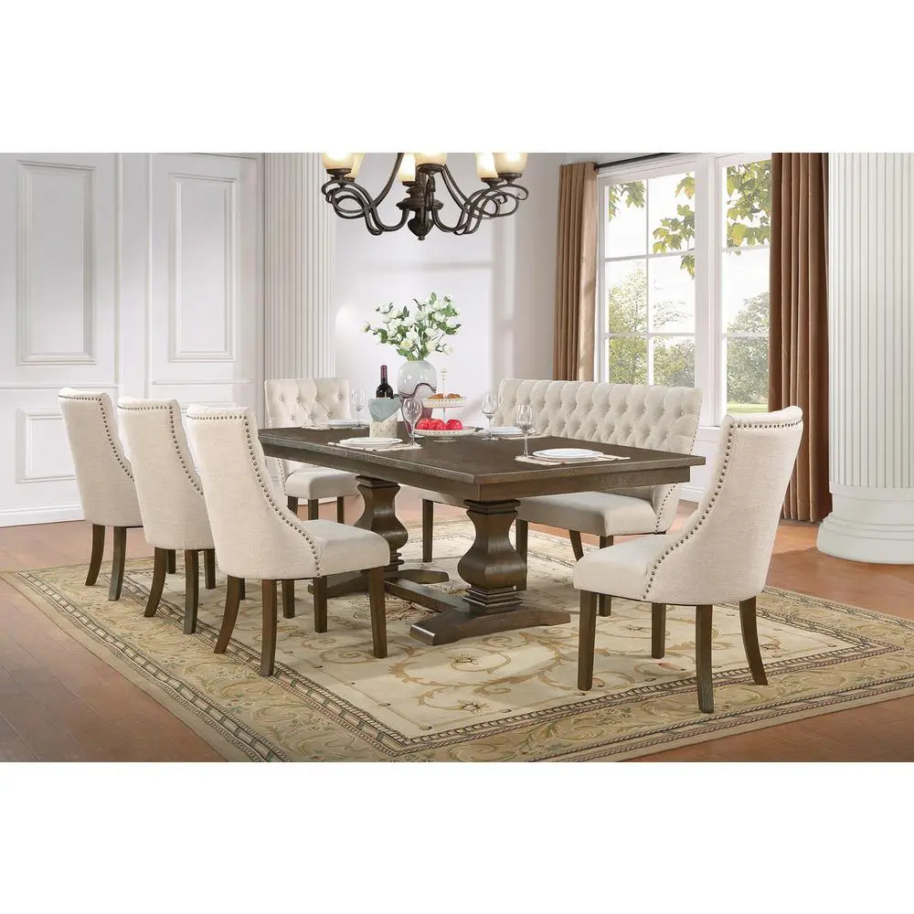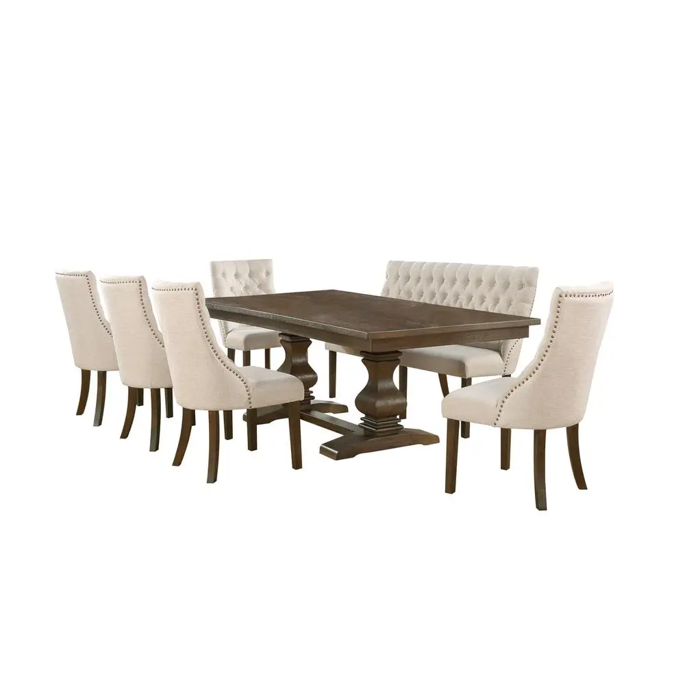 Enjoy a great dinner with family and or friends with this Best Quality Furniture elegant and comforatable 7pc dining set. This set includes one 78″ long dining table that features an extandable leaf that allows table to length to stretch out up to 96″ long. Set also features 5 beige linen fabric chairs and matching big dining bench.