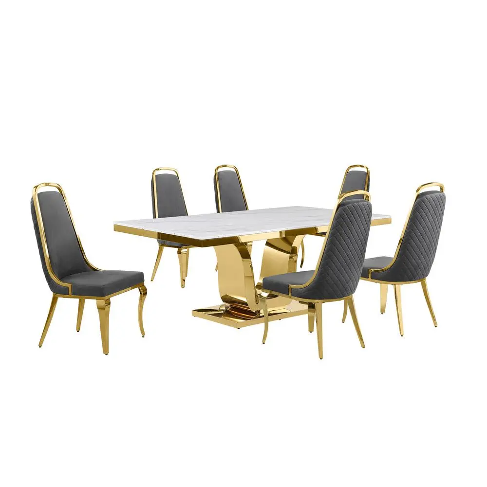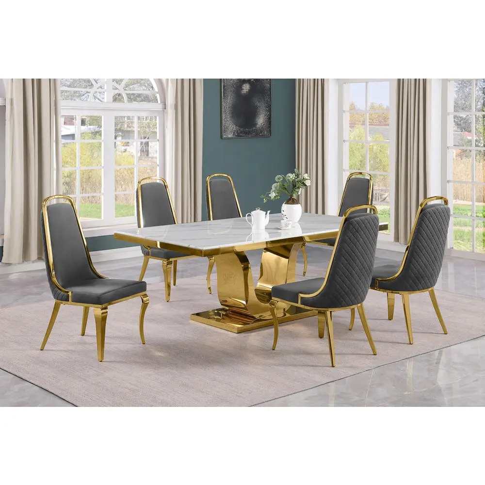 7pc Large(76″) marble top dining set with gold base and 6 Dark grey side chairs