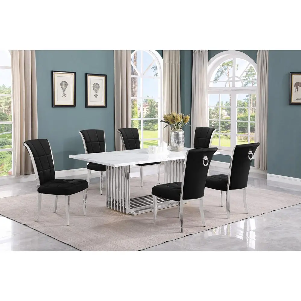 Experience a glam dining experience in the comfort of your home with this seven piece dining set composed of 1 white marble dining table and 6 stylish side chiars. The dining table is made of a 79″ long marble table top assembled on to a polished silver stainless steel base with a mirror finish. The side chairs feature a square stitching on velvet fabric, a decorative ring handle and constructed onto a durable iron frame with a silver chrome plating. This set requires assembly.