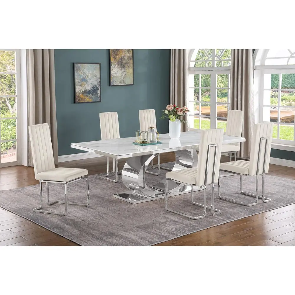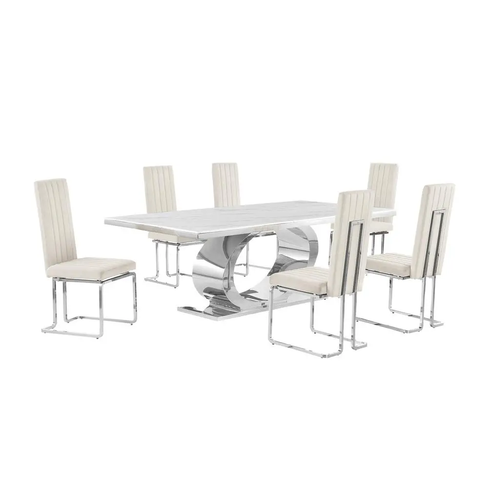 Experience a glam dining experience in the comfort of your home with this seven piece dining set composed of 1 white marble top dining table and 6 stylish side chiars. The dining table is made of a 87″ long marble table top assembled on to a polished silver stainless steel base with a mirror finish. The side chairs feature tall back rest and is constructed onto a durable iron frame with a silver chrome plating. This set requires assembly.