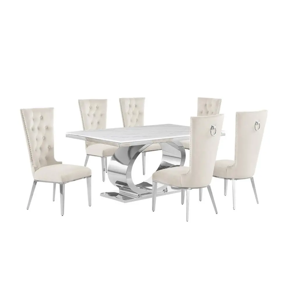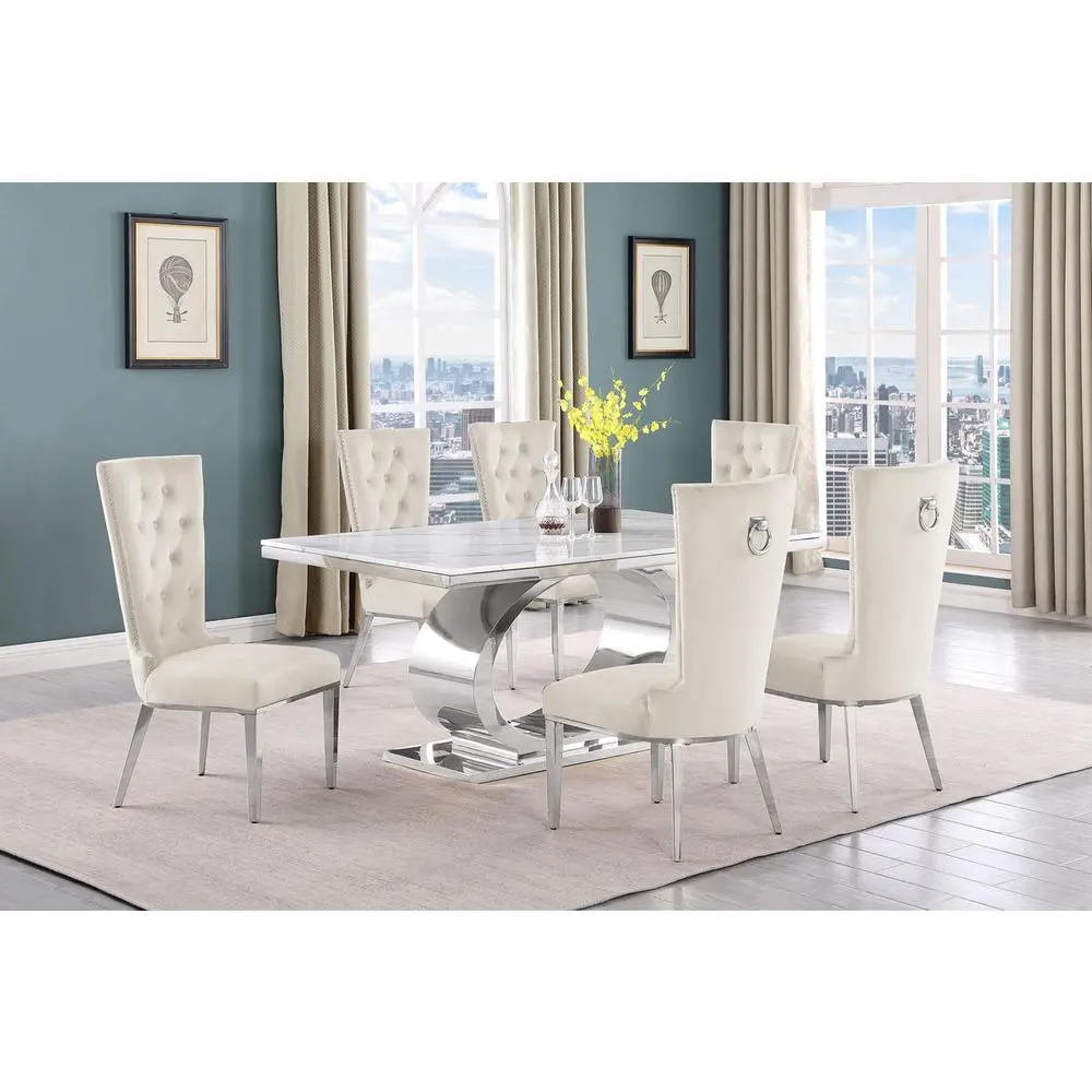 Be the first to review “7pc Small(68″) marble top dining set with silver base and 6 Cream side chairs”