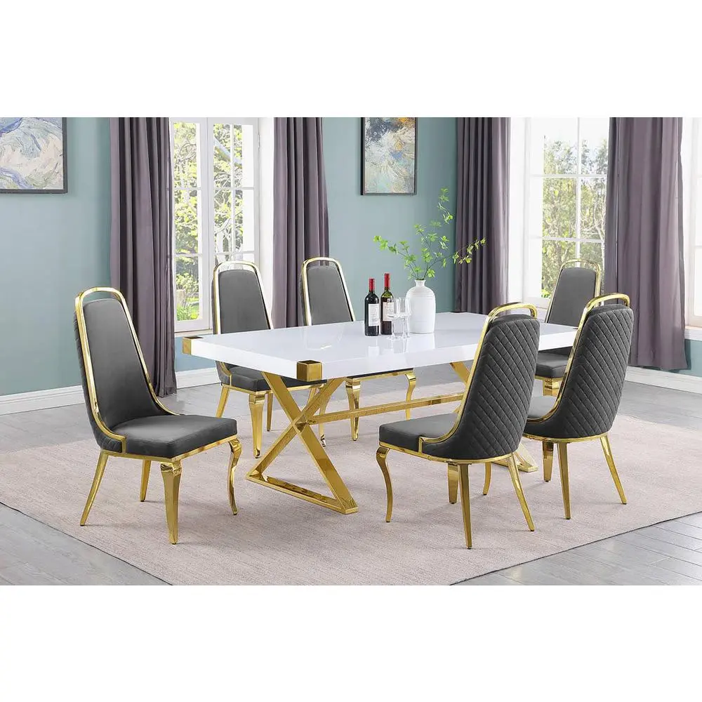 78″ long dining table White wood top 6 velvet side chairs Gold polished stainless steel Chrome iron Assembly required