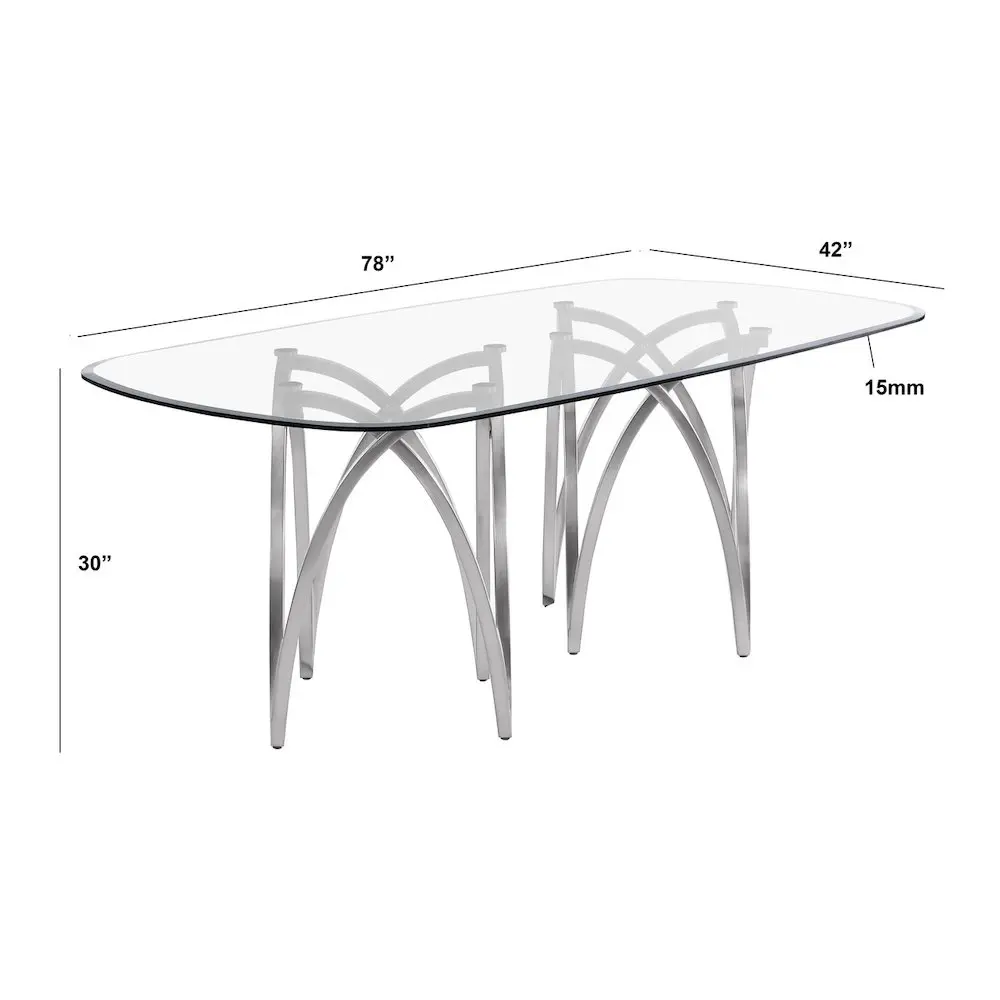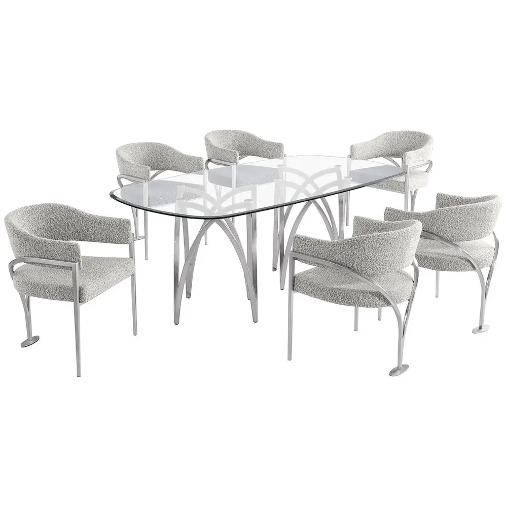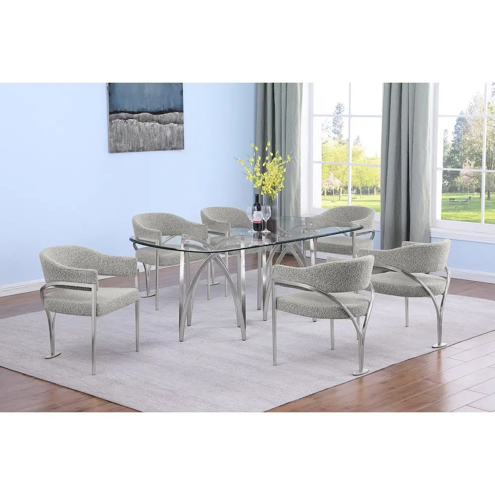 15mm Tempered Glass Brushed silver matte chrome-plated base 6 Rich gray boucle fabric chairs