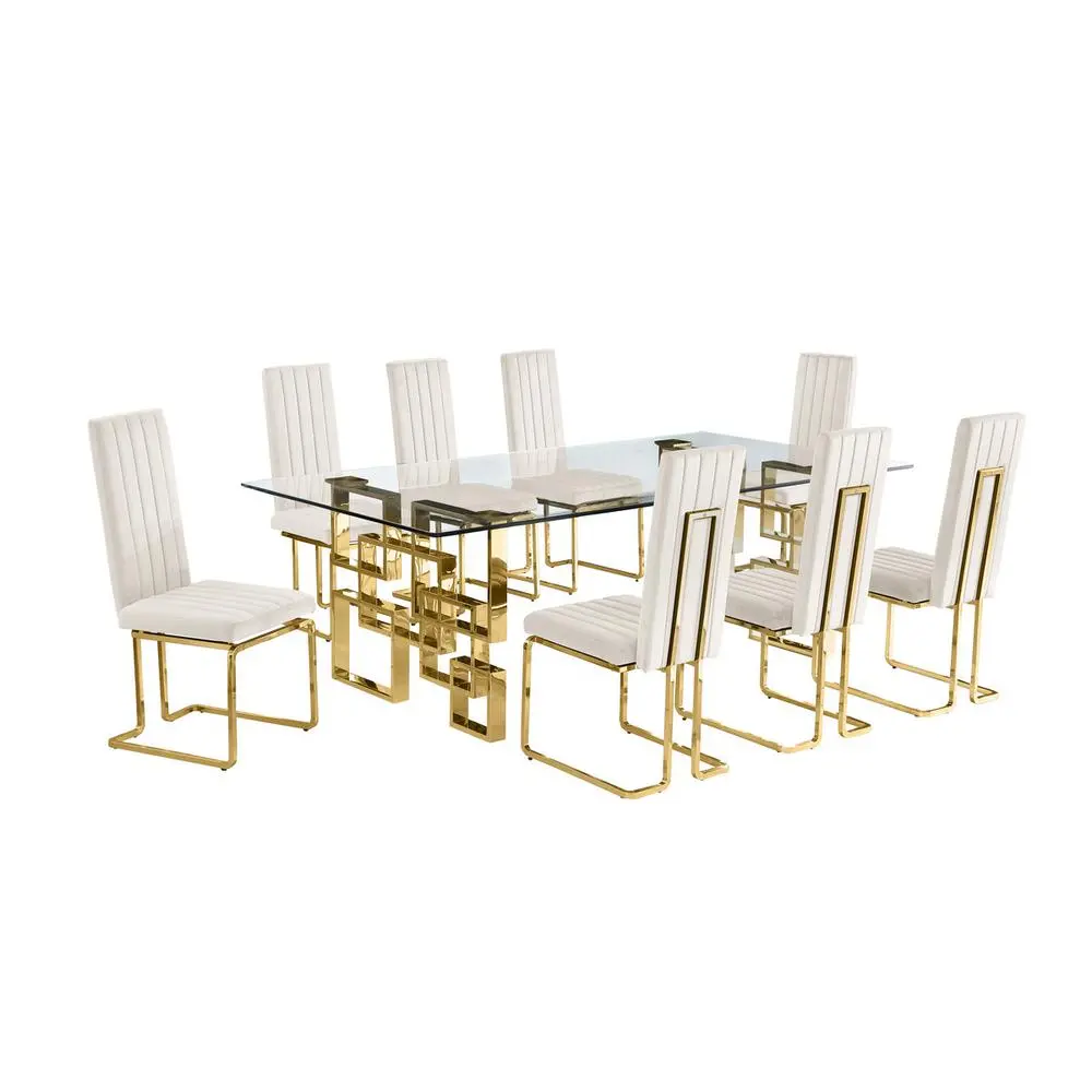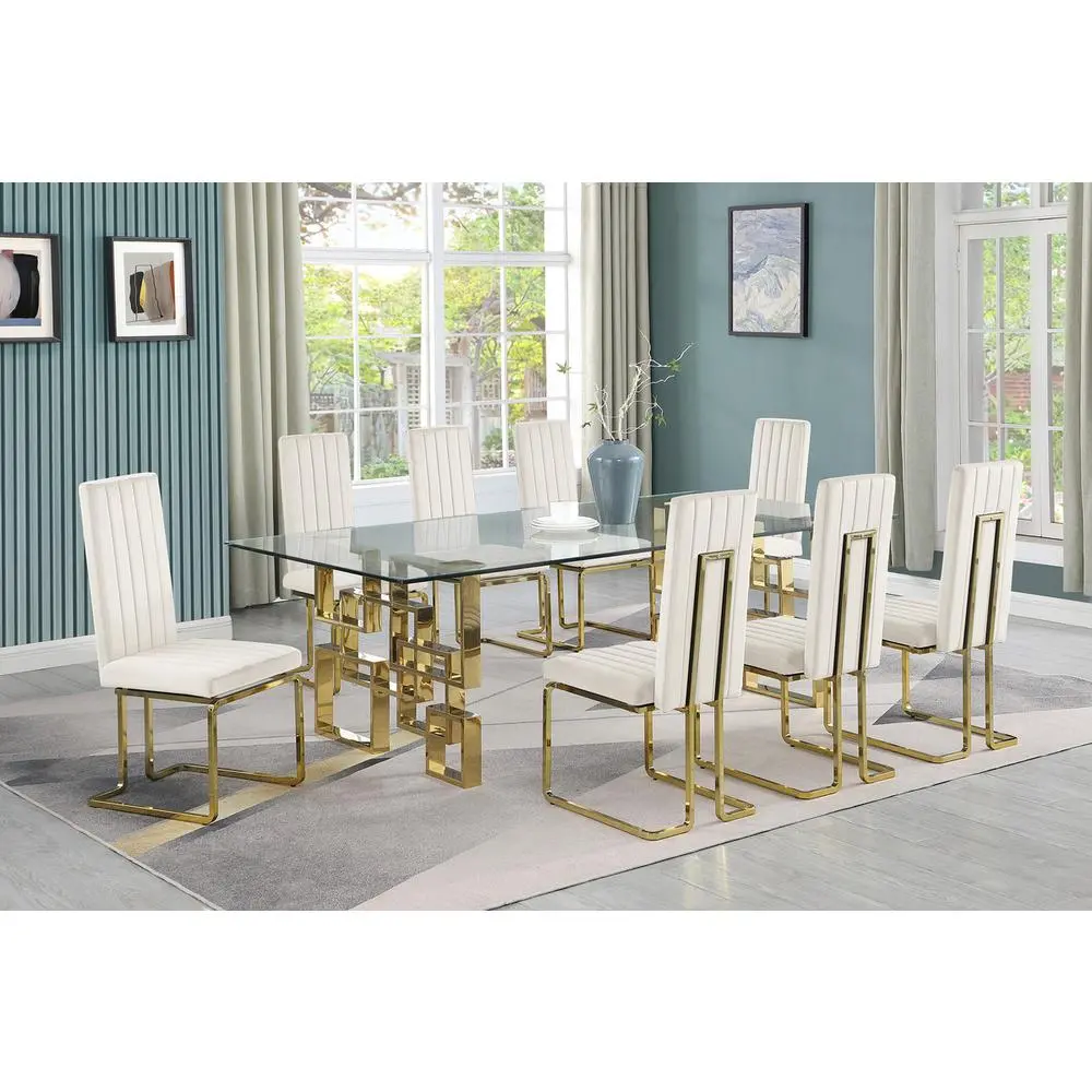Experience glam dining with every home made meal. Best Quality is adding to its glam collection this new dining set. The set features tall back side chairs upholstered with velvet fabric and structured on to a gold color base made out of chrome. Meanwhile, the dining table is made out of a 15mm thick and 95″ long tempered glass top and a gold color stainless steel base. All items in this set ship in thier own packing and require light to mid heavy assembly.