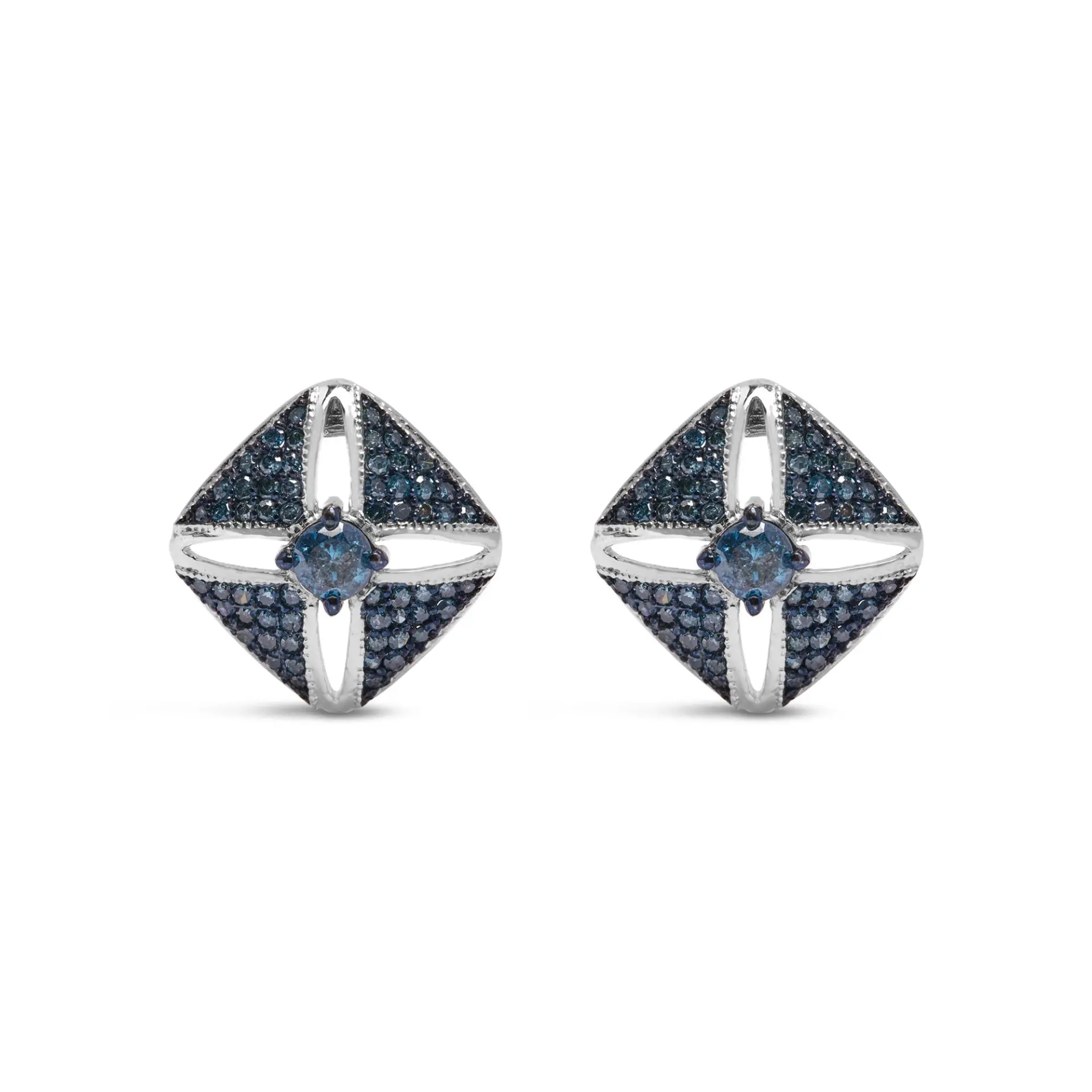 Immerse yourself in the elegance and unique allure of these rhodium-plated .925 sterling silver stud earrings, masterfully crafted into a chic rhombus shape. Each piece radiates sophistication, encrusted with a full carat of natural, color-enhanced blue diamonds. These gems, treated to unveil their mesmerizing hue, captivate with an exquisite arrangement that catches and reflects light with every movement. The clarity of I2-I3 ensures that the vibrant blue tones stand out brilliantly against the lustrous, mirror-like finish of the sterling silver. Designed for ease and comfort, they stay securely in place with a push-back closure, making them perfect for both everyday elegance.
